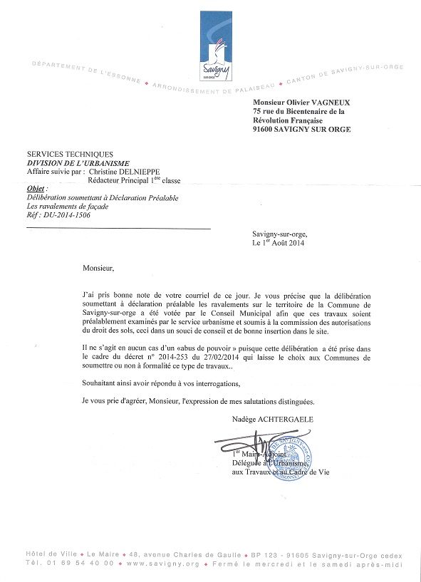 Je vous remercie de votre courrier en date du 1er août 2014, posté le 6 août 2014 et trouvé ce jour, samedi 16 août 2014. Il ne répond malheureusement pas à mes interrogations mais il possède au moins le mérite d’en créer d’autres. Naturellement, je me suis permis de publier votre réponse sur le site du « Savinien libéré » et cette lettre que je vous adresse, en copie à Madame Christine DELNIEPPE, qui suit cette affaire, à Madame Christine ROSSI, directrice des services techniques de Savigny-sur-Orge, et à Monsieur Éric MEHLHORN Maire de Savigny-sur-Orge.