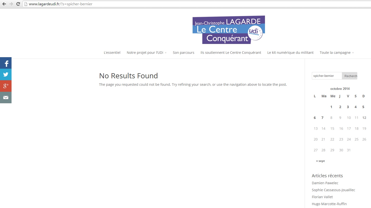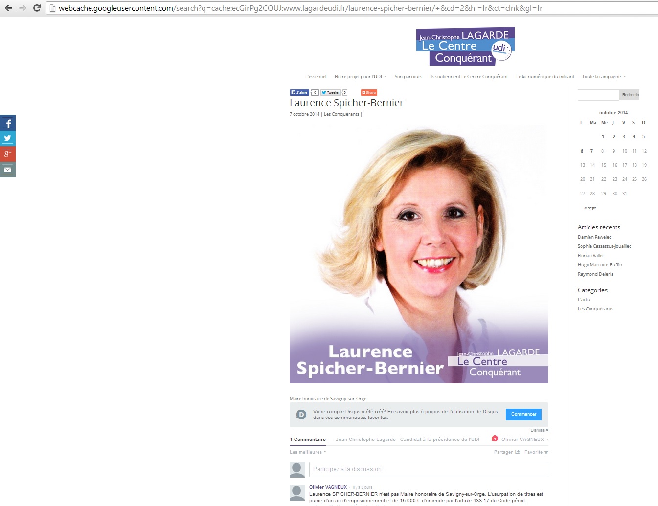 Jean-Christophe LAGARDE a perdu une « conquérante ». L’image de soutien de Laurence SPICHER-BERNIER, Maire de Savigny-sur-Orge de 2008 à 2014, ex-UMP, ex-CNI, UDI, a disparu de sa page des soutiens. De plus, elle est désormais introuvable sur son site. Sûrement que mon commentaire relatif à l’usurpation de titre faisait tache…
