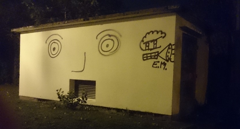 Alors que je marchais vendredi soir dans le quartier des Gâtines, j’ai pu observer plusieurs tags peints en noir. J’y vois un fumeur de drogue. Peut-être un soutien du parti de ceux qui voulaient légaliser le cannabis aux élections législatives de 2012 ? Je veux juste souligner que je trouve amusant que le tag soit signé « EM »
