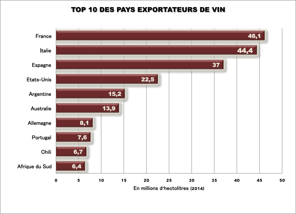 En 2013, l’exportation de vins et spiritueux a rapporté plus de 10 milliards d’euros à la France, soit 2,1 % des exports totaux, selon les données du site Ubifrance, établies par le ministère du Commerce extérieur. Un chiffre en progression constante, bien qu’il cache une diminution des volumes exportés. Ces dernières années, la Chine et la Russie ont volontairement réduit leurs importations d’alcools européens.