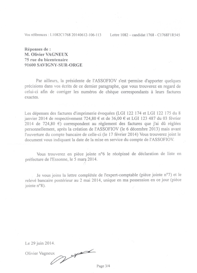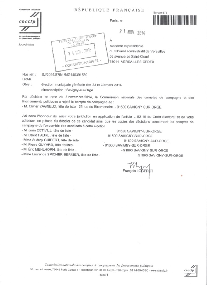 Reçu ce mercredi 26 novembre 2014 par recommandé avec accusé de réception. Il me reste donc moins de huit jours pour constituer un mémoire qui me permettra de me défendre dans l’affaire « CNCCFP contre Olivier VAGNEUX ». Et je leur répondrais à nouveau que j’ai réglé personnellement des dépenses (deux tracts) après déclaration de mon mandataire financier, parce qu’il a fallu deux mois (entre le 6 décembre 2013 et le 17 février 2014) pour trouver une banque qui accepte de m’ouvrir un compte de campagne. CQFD ou ce que l’État français ne ferait pas pour éviter de rembourser un candidat…