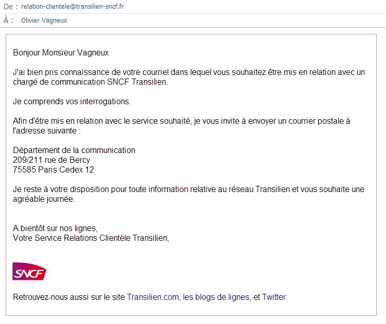 Une semaine après un certain courriel, et parce qu’il y a une obligation de réponse dans les huit jours. Mais faut-il appeler ainsi cette pseudo-réponse (avec les fautes qu’elle contient) ? Voilà, en tout cas, ce que m’assure la SNCF par rapport à certaines de mes demandes… Manifestement, le numérique (gratuit) n’est pas encore à la portée de tous…
