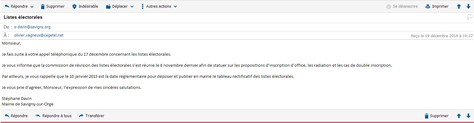 Courriel reçu de la Mairie de Savigny-sur-Orge sur mon mail personnel, que je n’avais pas donné !!!