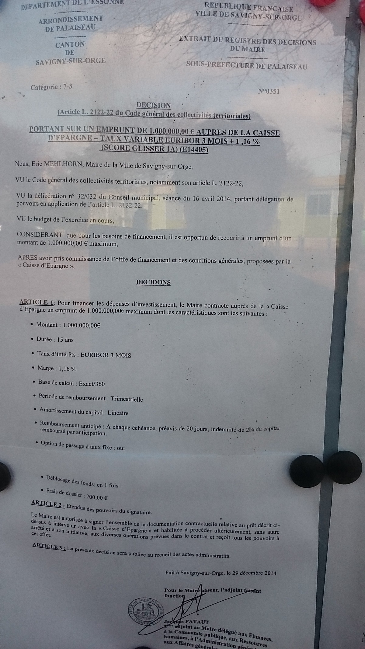 Le 29 décembre 2014, Jacques PATAUT réalisait un emprunt de 1 million € pour la Ville de Savigny-sur-Orge. Un capital réservé à de l’investissement. Toutefois, M. PATAUT, même s’il a choisi une catégorie d’emprunt qui n’est pas toxique, a fait le choix d’un emprunt à taux variable, basé sur l’indice « Euribor 3 mois » qui n’est pas le plus fiable. D’autant qu’il sert de base au marché des swaps, deuxième plus important pour les taux d’intérêts de la zone euro.