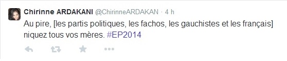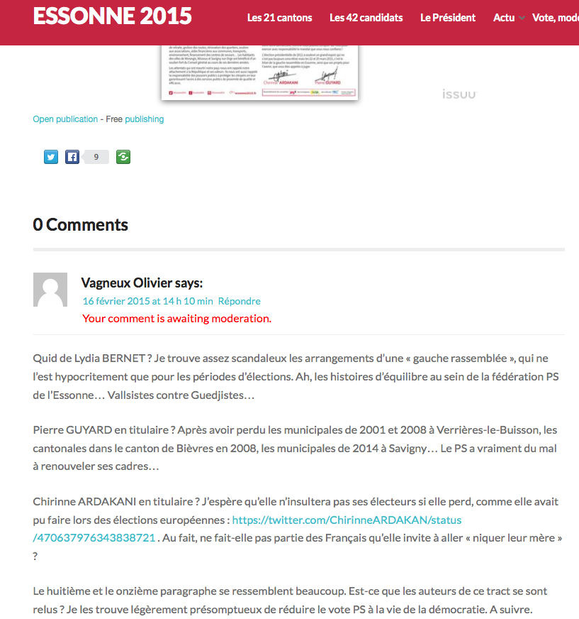 Non content de mes commentaires, voilà que je suis censuré sur le site Essonne 2015 de la « Gauche rassemblée« . J’imagine que le passage qui a fâché le modérateur est celui où je cite un tweet de la candidate ARDAKANI datant du 25 mai 2014. Un message dans lequel l’actuelle candidate insulte le choix souverain du peuple Français.