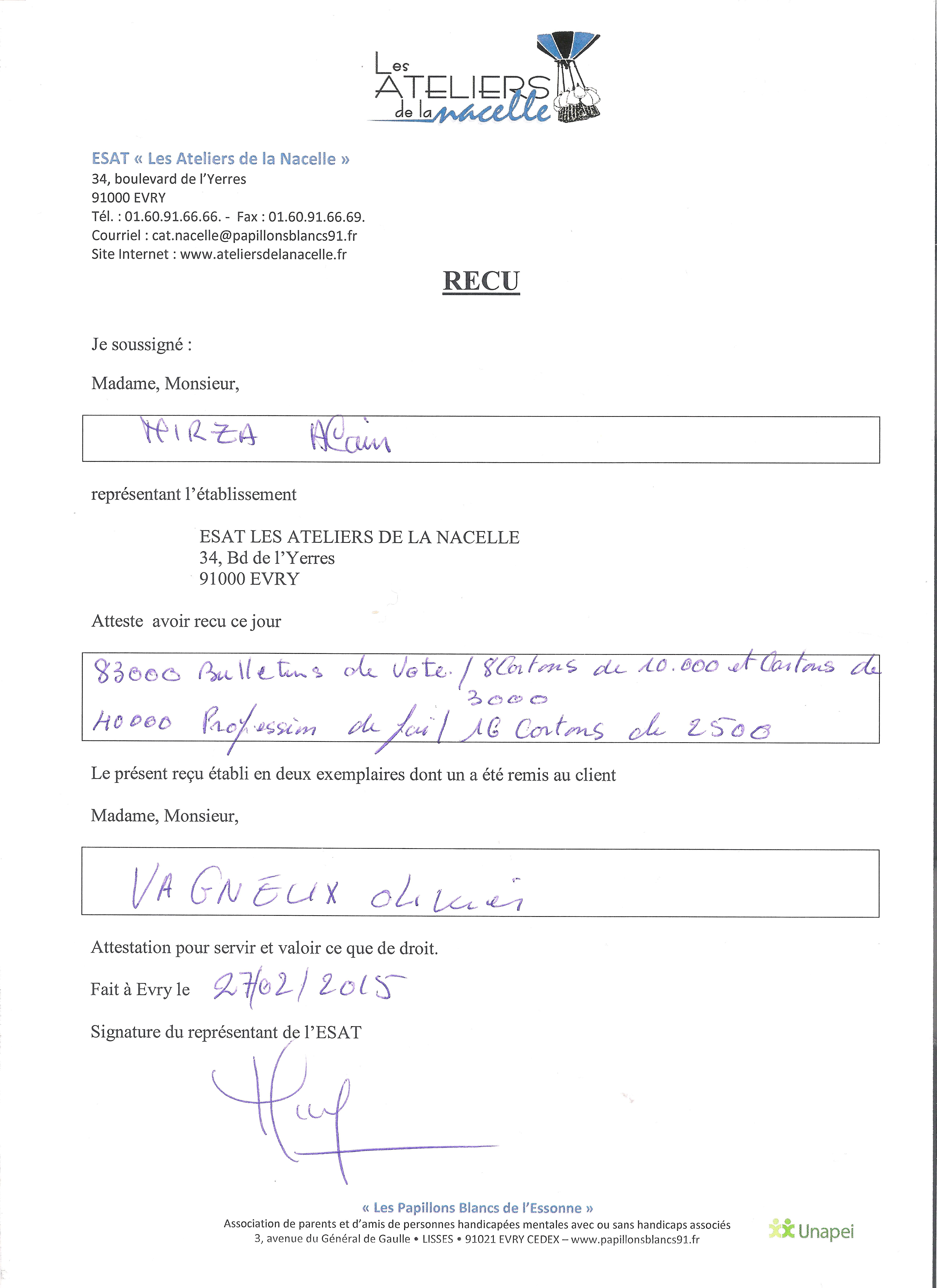 Premier à livrer la propagande à l’ESAT d’Évry qui m’a fait patienter un moment, le temps de réunir tous les documents adéquats. Et voilà ! En même temps, j’ai été livré des premiers tracts (de présentation des candidats). Bonnes âmes du canton qui voudraient nous aider à les distribuer, bienvenue. Faites-vous connaître à moi.