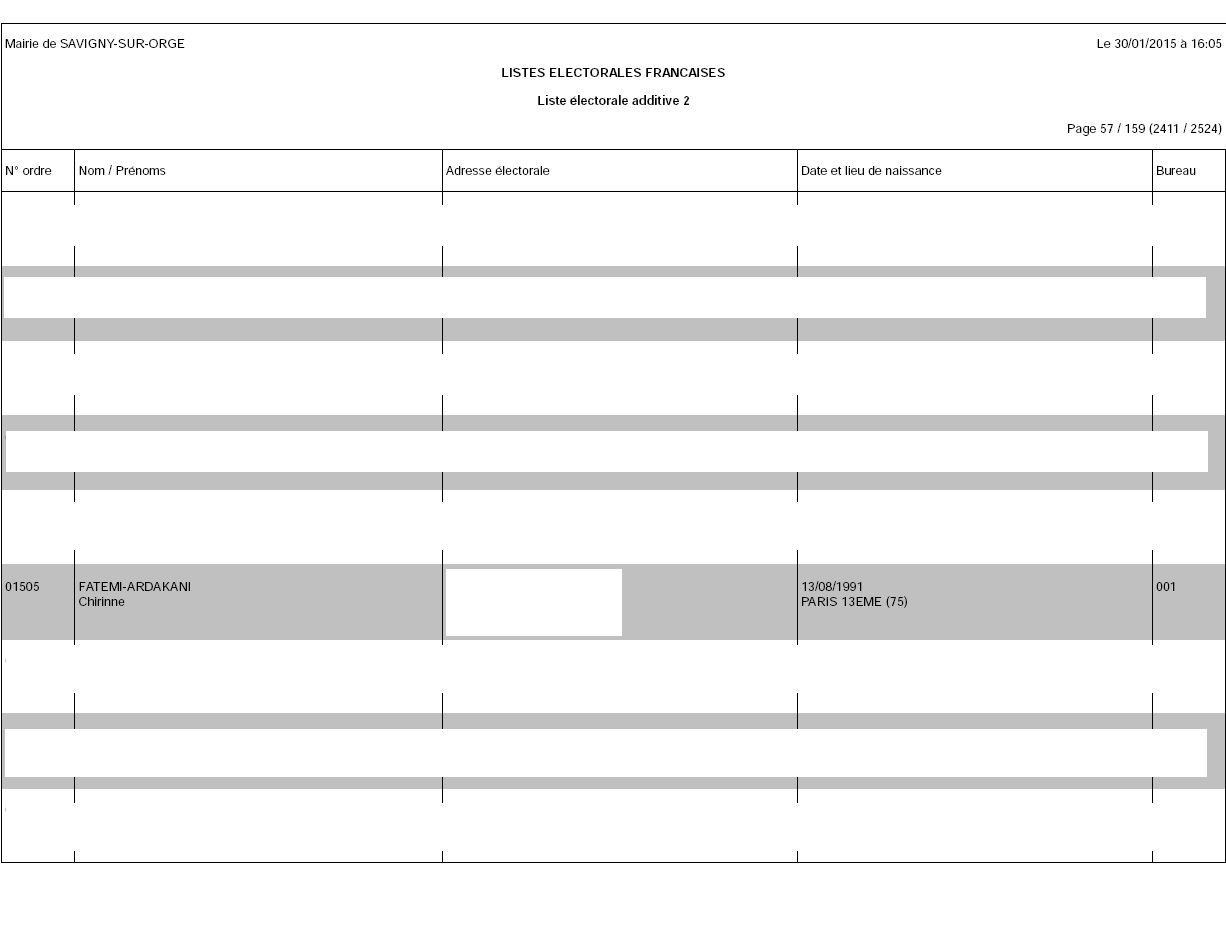 Dans la première (Savigny) validée par la Préfecture puisqu’en date du 30 janvier 2015, la demoiselle porte le numéro d’ordre 1505. Le fait qu’elle apparaisse sur la deuxième additive prouve qu’elle est une jeune inscrite, probablement pour les municipales de 2014.