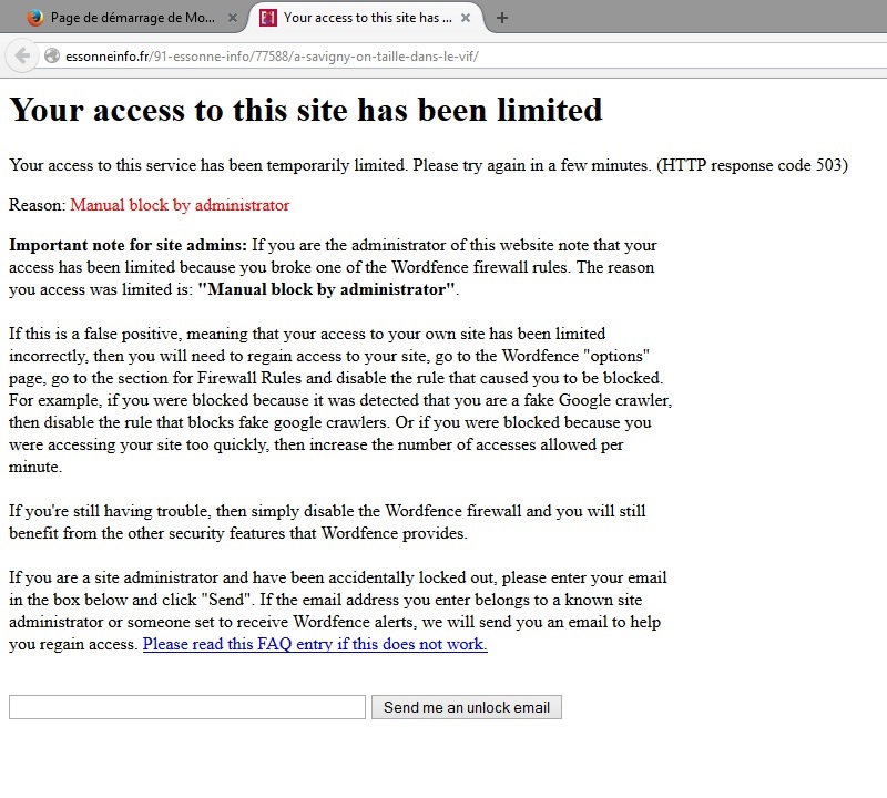 Quelle n’est alors pas ma surprise lorsque cette nuit, je me connecte pour suivre l’affaire et que je me retrouve face à cette page. J’ai été bloqué par l’administrateur et je ne peux plus accéder à leur site. Qu’ils me censurent, je peux le comprendre, ce n’est pas la première fois. D’autant plus quand je fais dans la provocation, mais qu’ils me bloquent par rapport à mon adresse IP… C’est assez petit pour des gens qui ont été Charlie et qui ne veulent pas me laisser m’exprimer.