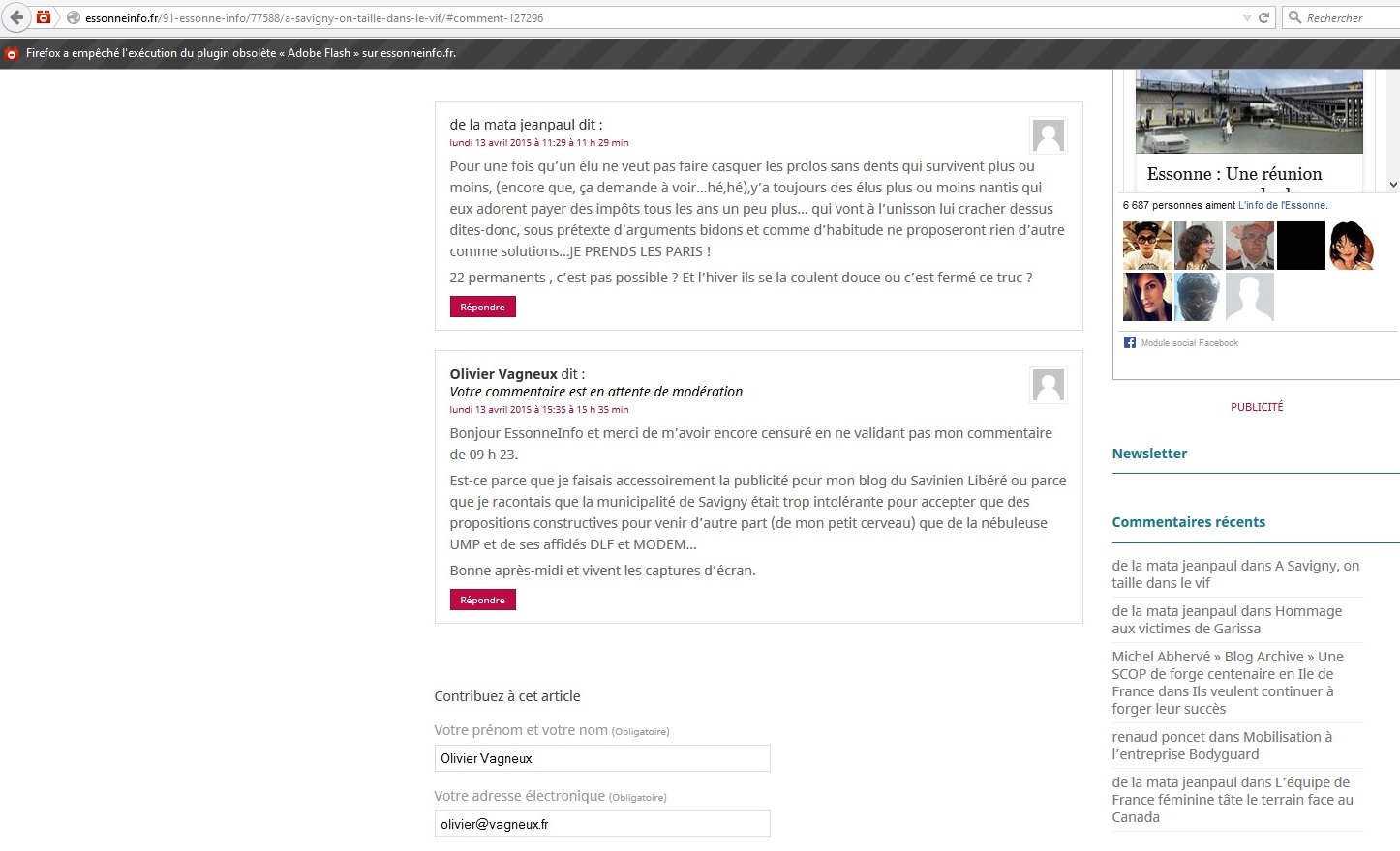 Edit : J’ai envoyé ce mardi 14 avril 2015 un message électronique de demande d’explication à la rédaction d’EssonneInfo. J’attends d’obtenir leur réponse pour la publier à son tour et voir ce qu’ils peuvent me répondre, s’ils me répondent. Je serai sinon curieux de savoir tant que les lois privatives sur Internet ne sont pas votées, s’ils ont le droit de faire cela…