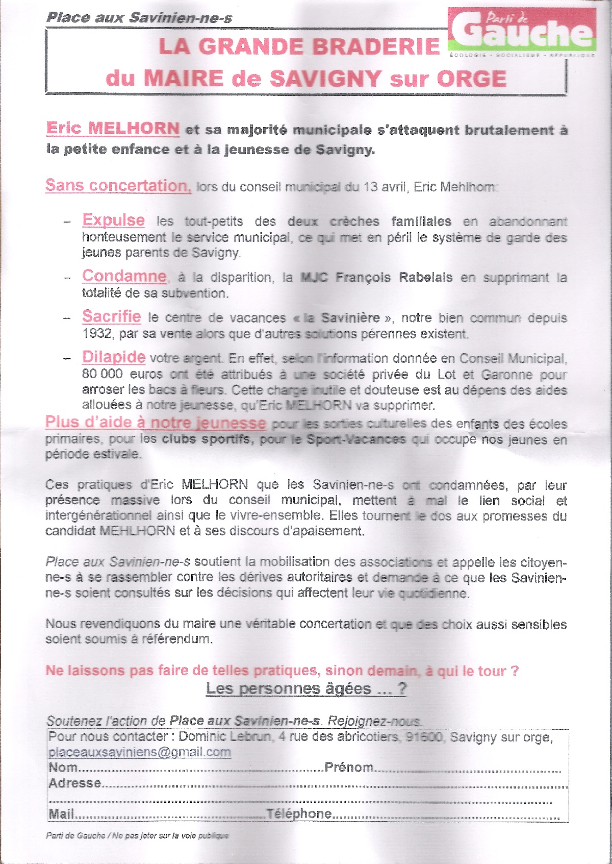 Le Parti de gauche (pardon Place aux Savinien-ne-s, leur association d’influence) et son vocabulaire sensationnaliste qui veut masquer la vacuité de leurs propositions
