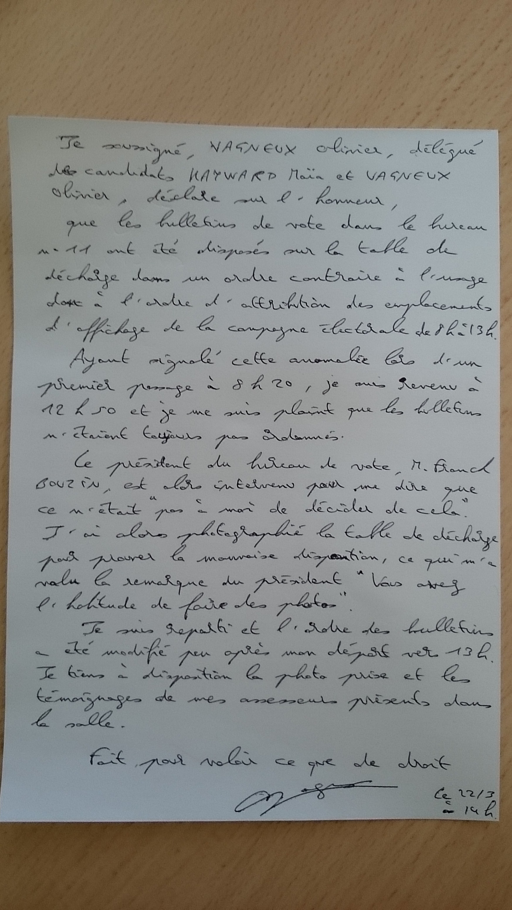 C’est alors que Franck BOUZIN intervient, énervé, en me disant « M. VAGNEUX, ce n’est pas vous qui décidez« . Mes assesseurs en sont témoins. Je décide alors de faire des photos pour prouver que M. BOUZIN a tort. Et j’ai droit à une cinglante remarque du président du bureau « Ah, ça, M. VAGNEUX, vous avez l’habitude de faire des photos« . Il est vrai qu’entre taper dans une balle puis courir et faire des photos pour alerter et dénoncer, j’ai choisi mon parti (c’est petit de ta part !!!).