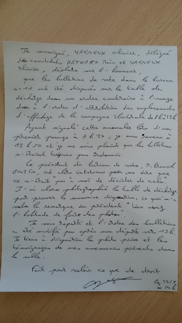 Je reviens à 12 h 50 et je vois les bulletins toujours dans le désordre. Je redemande au secrétaire de mairie de placer les bulletins (placés comme sur la photo) dans l’ordre et ce dernier me répond que la Loi ne l’y oblige pas. Je demande si le magistrat du Conseil constitutionnel est passé et s’il ne l’a pas signalé. On me répond que NON. Je redemande encore une fois de remettre les bulletins dans l’ordre.