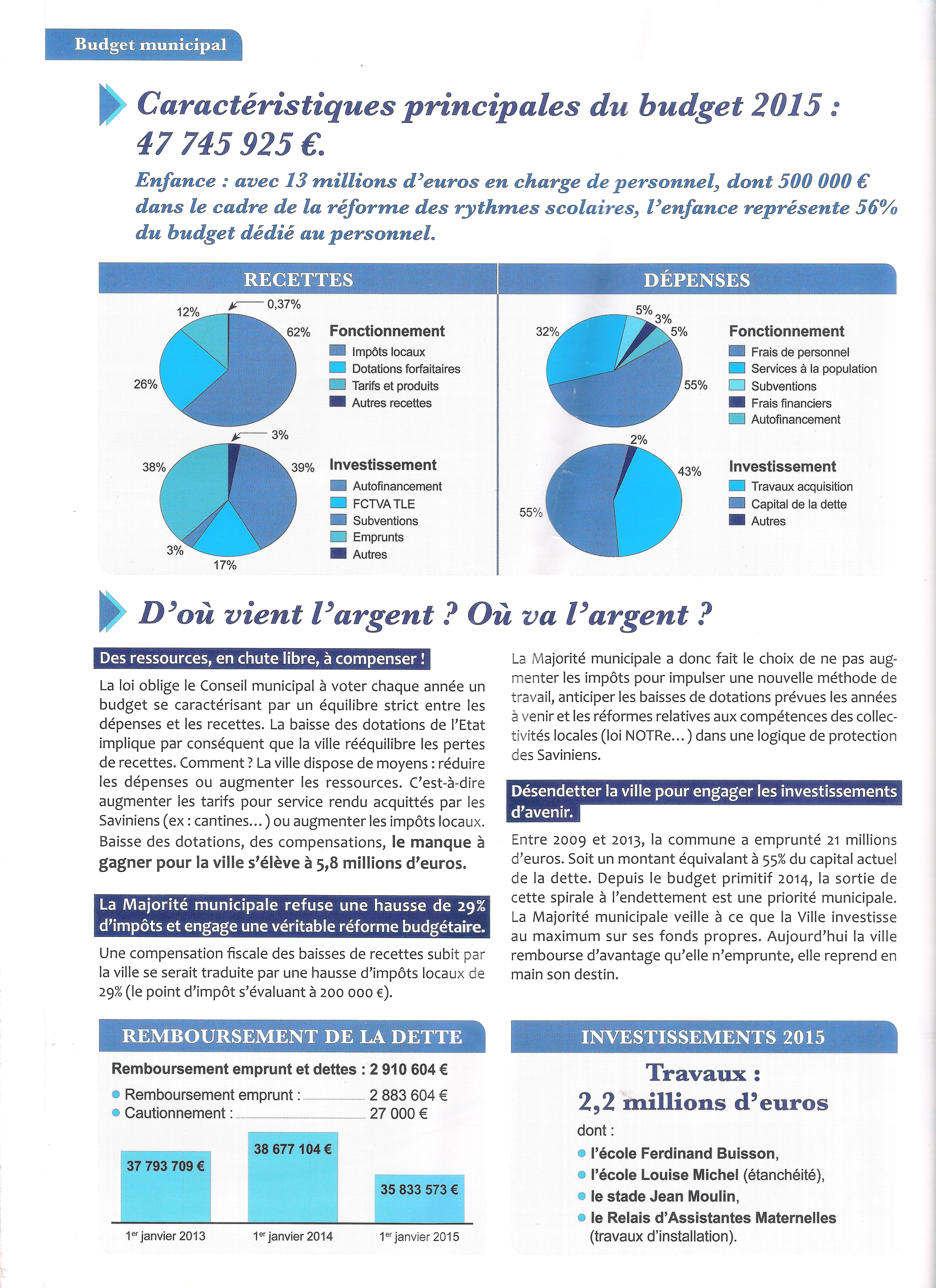 Si Savigny consacre 13 millions d’euros à l’enfance, alors on ne dépense que 10,21 millions d’euros pour le reste de notre fonction publique territoriale. Puisque Savigny dépense 23,21 millions de son budget pour son personnel, alors elle utilise 48 % de son budget total pour son personnel dont en effet 55 % de son budget de fonctionnement (42 500 341 €). Mais tous ces chiffres ne prennent pas en compte toutes les délégations de service public et tous les emplois non salariés directement par la Ville…