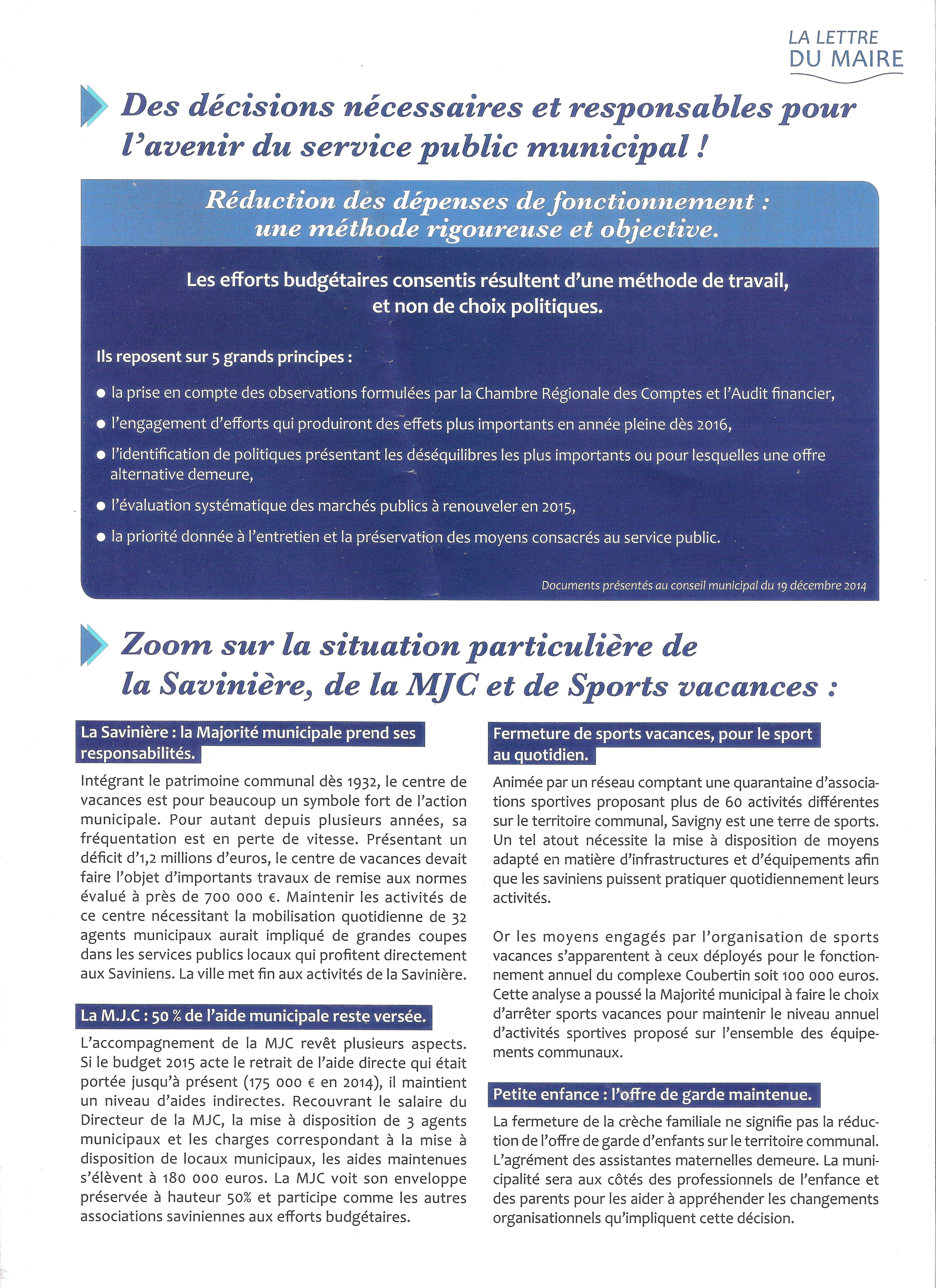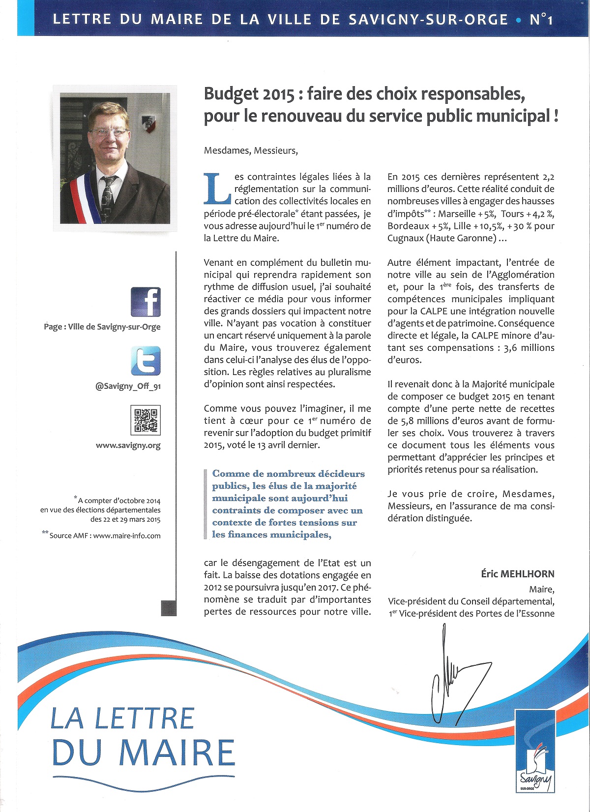 Donc les propositions mehlhorniennes sont actées et on écrit pour rassurer les retraités et l’électorat traditionnel de la droite UMP pour dire que c’est ce qu’il y avait de mieux à faire, qu’on sait ce qu’on fait (sauf que les conseillers municipaux n’étaient pas au courant l’avant-veille…) et que la mobilisation des Saviniens n’a pas lieu d’être parce qu’il n’y a aucun problème à Savigny-sur-Orge. Au fait, combien a coûté cette blague sur 4 pages ?