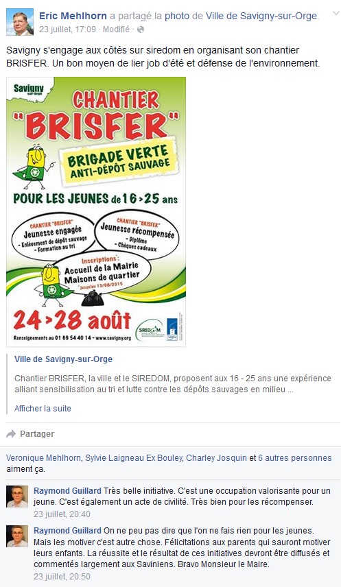 J’en veux pour preuve de ce que l’on peut lire sur le compte Facebook du maire de Savigny-sur-Orge : « Savigny s’engage aux côtés sur SIREDOM en organisant son chantier BRISFER. » Ce post a déjà été modifié le 23 juillet à 17 h 09 mais manifestement le rédacteur ne s’est pas rendu compte qu’il employait une mauvaise préposition. Il aurait en effet dû remplacer « sur » par « du« , enfin cela si Éric MEHLHORN savait ce qu’est le SIREDOM.