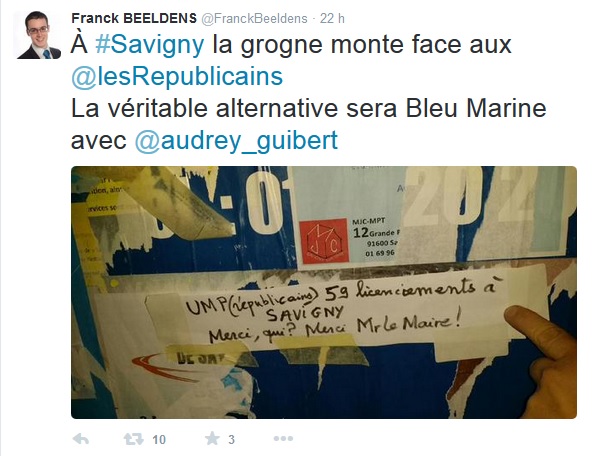 Alors que je faisais ma revue de presse des comptes Twitter des partis d’extrême-gauche, je suis tombé en arrêt devant le compte de M. Franck BEELDENS-DA SILVA, élu du Front national à Épinay-sur-Orge. Ce dernier cherchait à instrumentaliser la révolte savinienne, en prétendant que la colère profiterait à son parti et à Audrey GUIBERT. J’en doute.