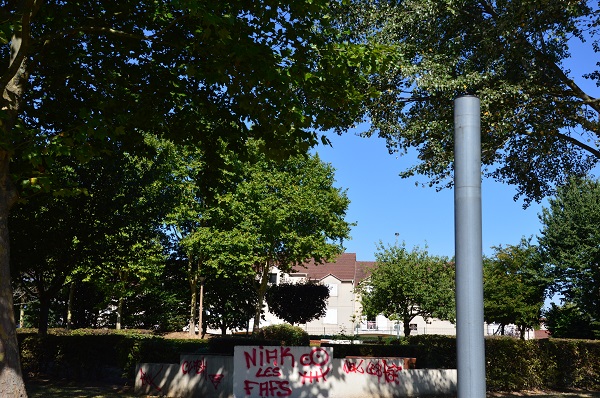 Lorsque les deux plaques du parc ont été taguées, là aussi par des cons qui auraient un peu plus filé droit sous l’Occupation, s’ils n’avaient pas eux-mêmes collaborés pour assurer leur situation, une première plaque a été retirée. La deuxième a été laissée de manière à permettre l’identification du parc. Quatre ans après, nous attendons encore que la première soit changée.