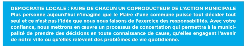 En 2015, je ne peux plus faire comme avant 1789. Je vais donc vous demander votre avis sur la couleur des peintures (la fameuse concertation) pour des projets que je déciderais du début à la fin, puisque j’ai été élu et que je suis le seul à pouvoir les décider. Je ne vous consulterais pas trop souvent (une fois tous les ans), parce qu’une fois que je vous aurais entendu, ce sera bon. Précision ; je ne vous écoute que si c’est moi qui contrôle tout. Pas autrement si ça m’échappe.