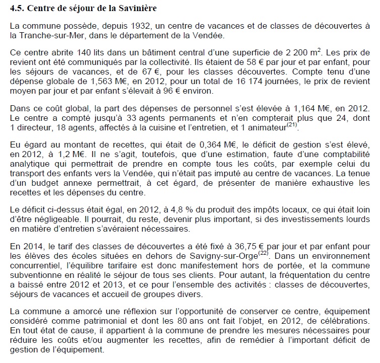 Nous précisons pour cet exercice que nous nous basons sur le nombre de 96 € (rapport de la Chambre régionale des comptes en fin d’article) qui est une moyenne et qui prend en compte la « subvention » savinienne aux enfants des autres communes. En effet, les autres communes qui ont pu utiliser la Savinière ont toujours bénéficié d’un tarif qui n’a jamais équilibré le coût de revient que cela occasionnait à Savigny. Une énième erreur de gestion de la prétendue « droite ».