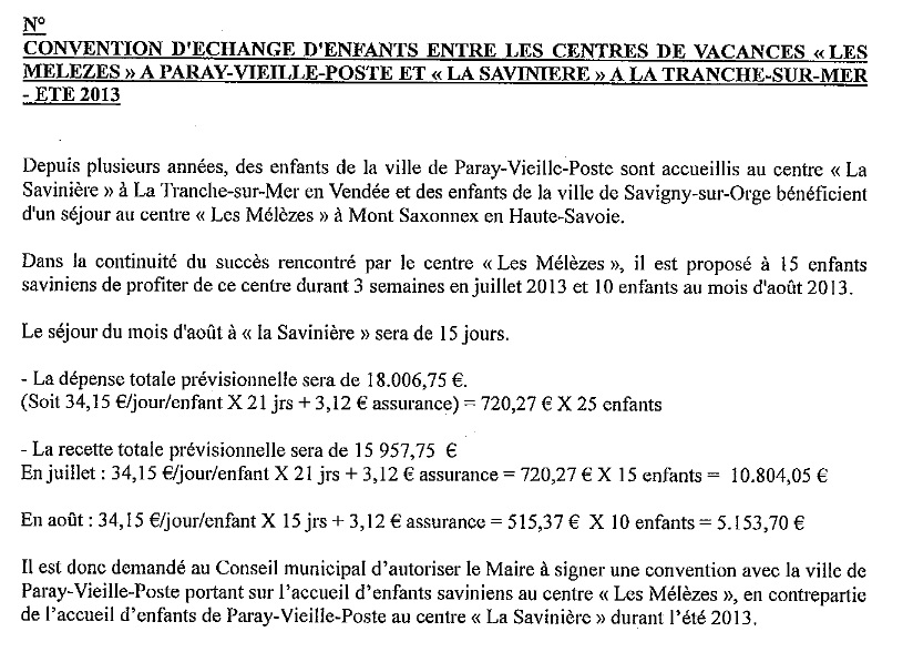Sauf que ce calcul inintéressant est malhonnête, car si Savigny avait fait payer aux autres communes le tarif que leurs charmants enfants (40 % des utilisateurs hors-communes) coûtaient réellement à la Ville, alors la moyenne par jour et par enfant ne serait pas de 96 €, mais bien en dessous. Exemple du prix de location à Paray !!!