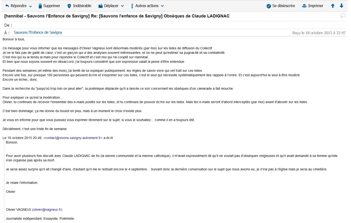 Depuis ce dimanche 19 octobre 2015, je suis officiellement modéré dans les propos que je peux tenir sur la liste de diffusion du collectif « Sauvons l’enfance de Savigny ». Une décision collective prise à l’unanimité d’une seule personne, qui reproche son comportement à Éric MEHLHORN mais qui se conduit comme lui. La « mehlhornisation » des Saviniens est en marche. Saurons-nous y résister ?