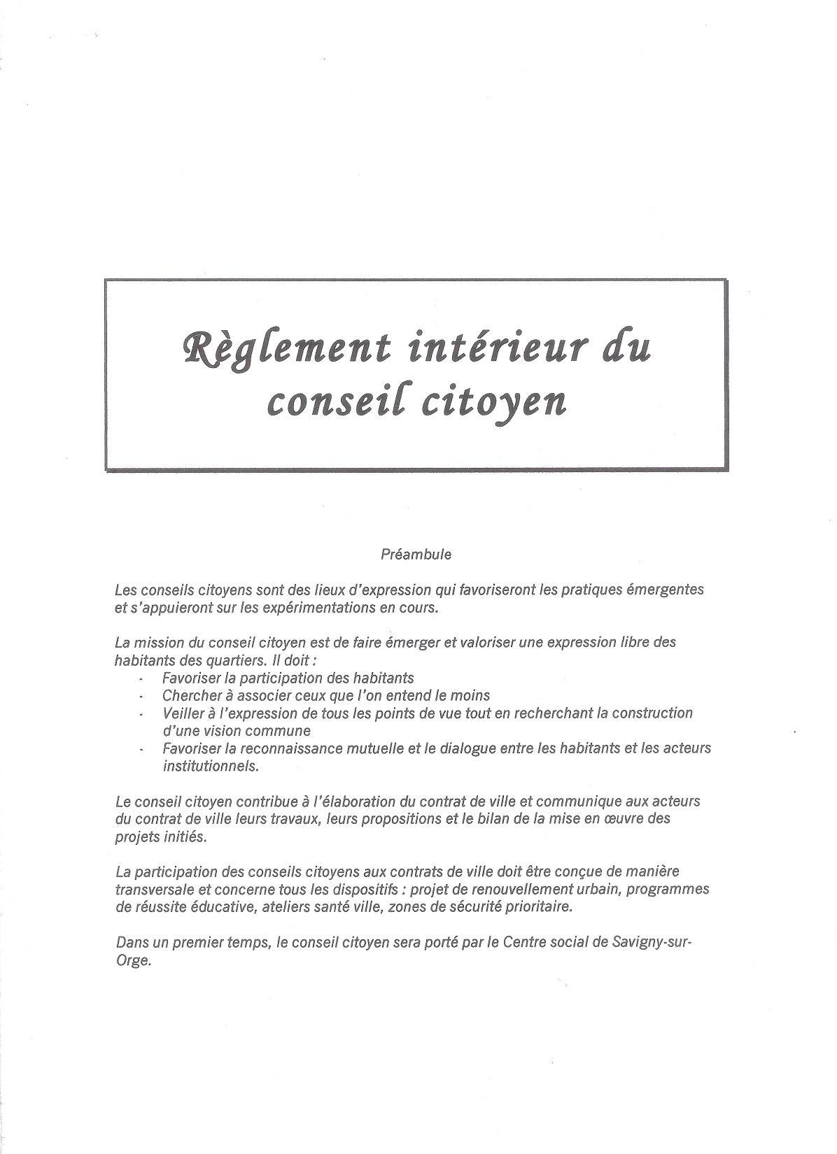 Selon le cadre de référence des conseils citoyens, les différents conseils doivent se doter d’un règlement intérieur. Celui de Grand-Vaux à Savigny-sur-Orge (que je publie ici) est d’autant plus étrange qu’il a été proposé, sous le contrôle des services du Préfet, par un organisme (l’IFAC) qui s’établit dans le texte comme coordinateur et se confère de larges pouvoirs.