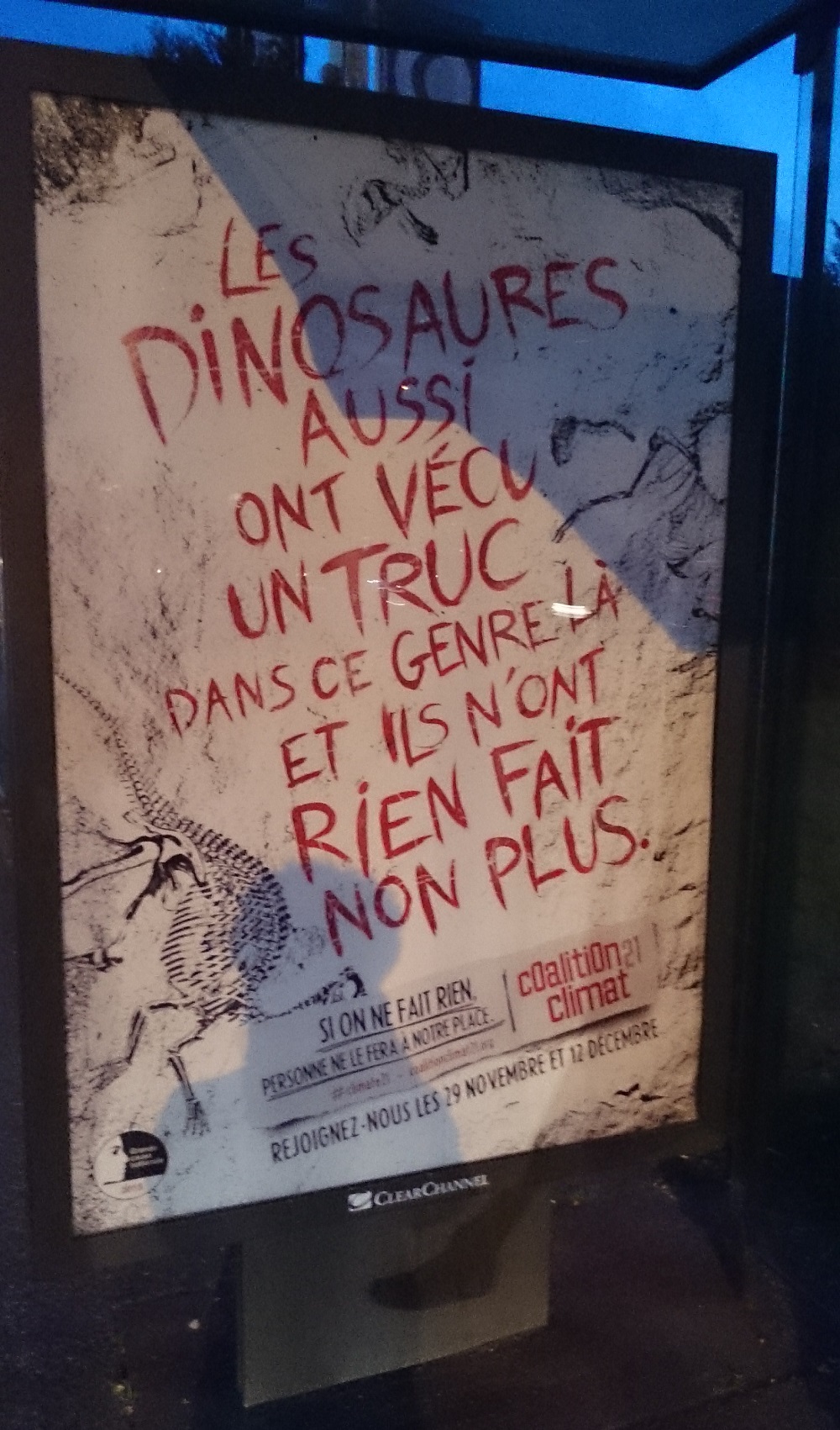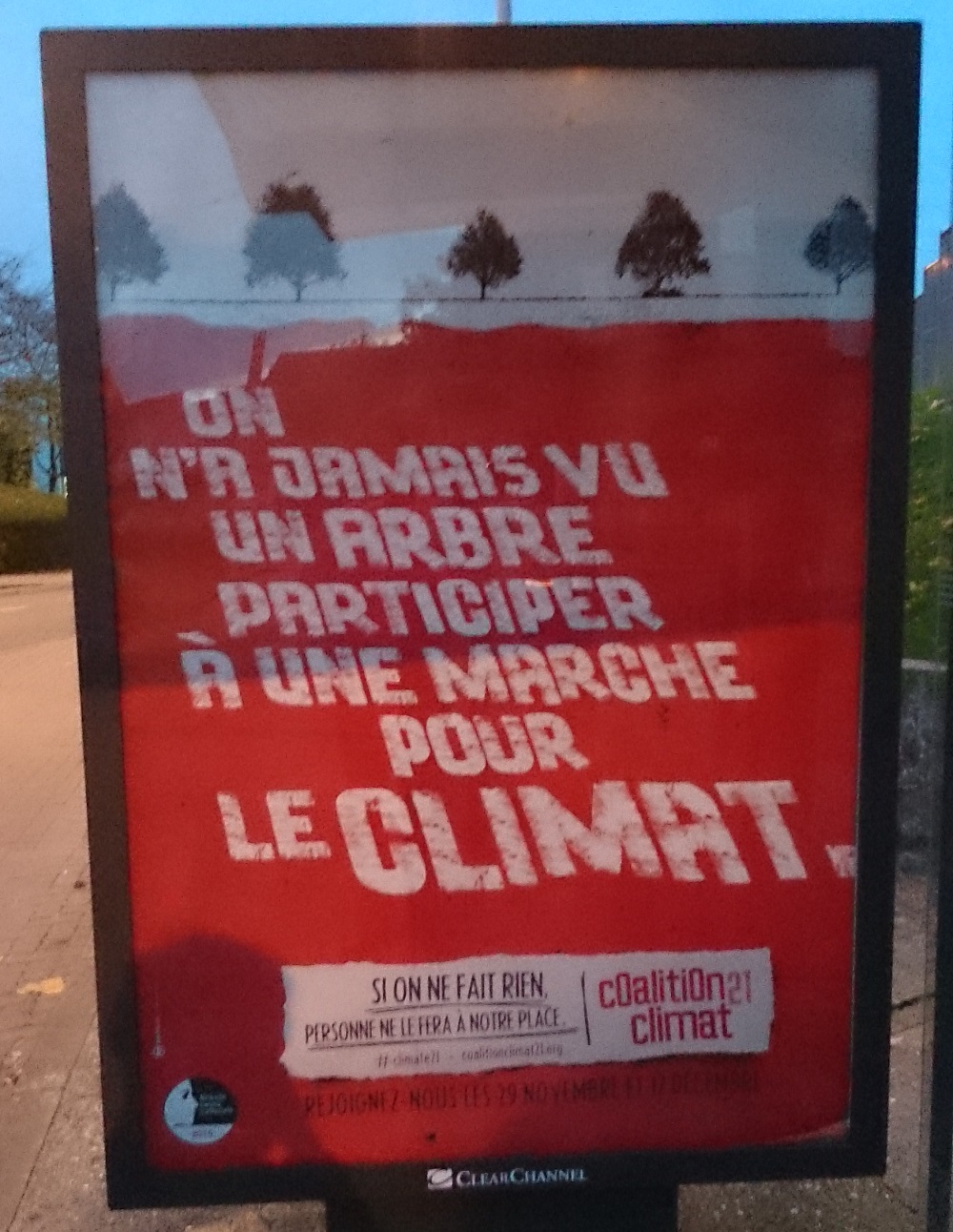 J’aime bien manifester, surtout contre le mariage pour tous, mais parce qu’il y a un but recherché. Ici, à quoi sert de marcher le premier et le dernier jour de la COP ? À chercher l’échec des politiques en leur disant que seule la force citoyenne détient la vérité ? Ensuite, le message est stupide vis-à-vis de végétaux qui existaient avant l’ère actuelle. À part dans le Seigneur des anneaux (ce sont des Ents) ou dans Les chroniques de Narnia, les arbres ne marchent pas.