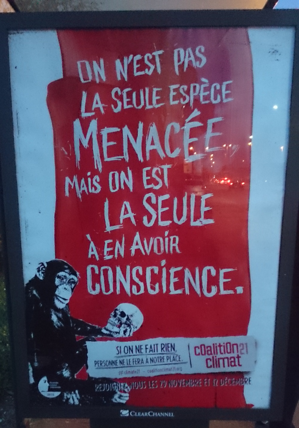 Aucun problème avec le message mais pourquoi dessiner un singe regardant dans un crâne humain à la façon shakespearienne ? Puisque le singe n’a pas conscience d’être menacé, pourquoi nous joue-t-il Hamlet ? D’autant que si l’Homme disparaît, le singe aussi vu qu’il vit dans le même milieu, avec les mêmes conditions. À la rigueur, un rat survivra puisque c’est l’une des espèces qui s’adaptent le mieux. Mais il ne peut pas tenir un crâne…