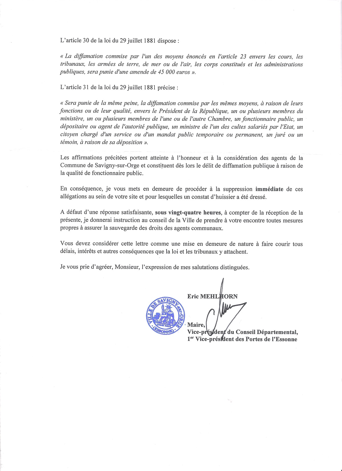 La rédaction du Savinien libéré vous informe avoir reçu ce samedi 14 novembre 2015 au matin une mise en demeure du maire de Savigny-sur-Orge (sous forme d’ultimatum de 24 heures). Nous préparons une réponse qui n’ira pas dans le sens de l’édile. Nous sommes en France, en République et en démocratie. Nous pouvons encore poser des questions. L’emploi du conditionnel à des fins rhétoriques ne saurait affirmer quoi que ce soit.