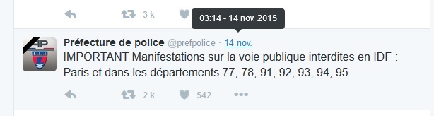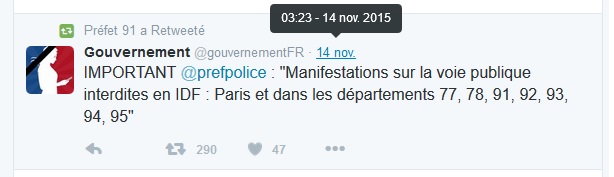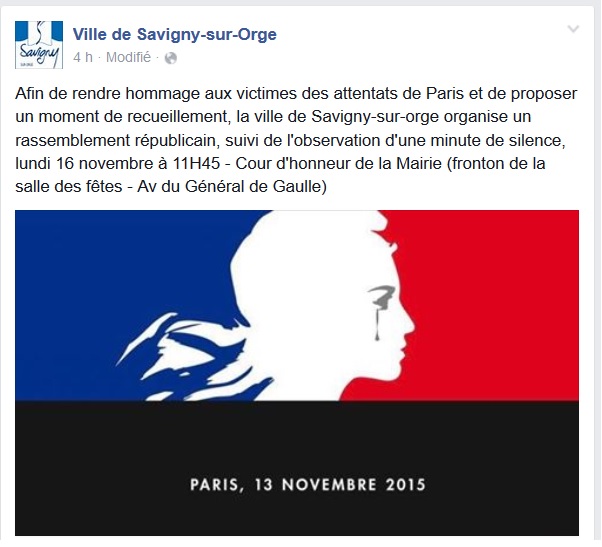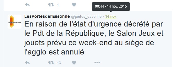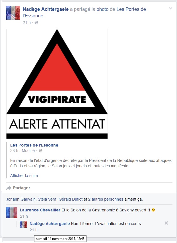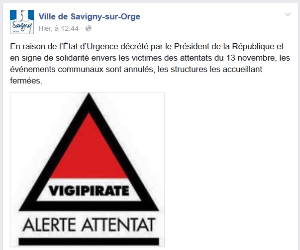 À 12 h 43, Nadège ACHTERGAËLE, première adjointe de Savigny fait savoir par Facebook, qu’à la suite de la CALPE qui annule tous ses événements culturels et sportifs, le salon de la gastronomie est en cours d’évacuation. À 12 h 44, la Ville l’annonce à son tour en invoquant elle aussi la situation d’état d’urgence. Rappelons qu’il s’agit d’un décret présidentiel annoncé vers 00 h 10 et signé à 01 h 35. Savigny a donc mis 12 heures à percuter l’information…