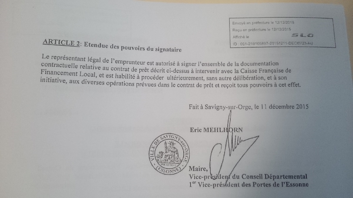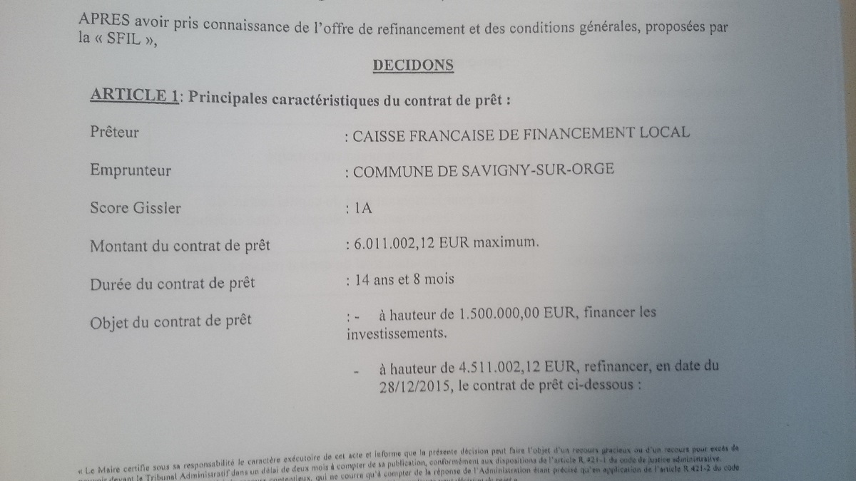 Donc c’est cool, au lieu de rembourser 380 000 € de capital et d’intérêts d’emprunts évolutifs, nous allons désormais rembourser 400 000 € car le maire de Savigny a emprunté 6 011 002,12 € (1,5 M € pour investir et 4,5 M € pour casser l’emprunt toxique et racheter la somme due avec 280 000 € de pénalités) le 11 décembre 2015 sur 14 ans et 8 mois à la place de la somme usuelle que nous remboursions alors mais qui aurait tôt ou tard été plus importante.