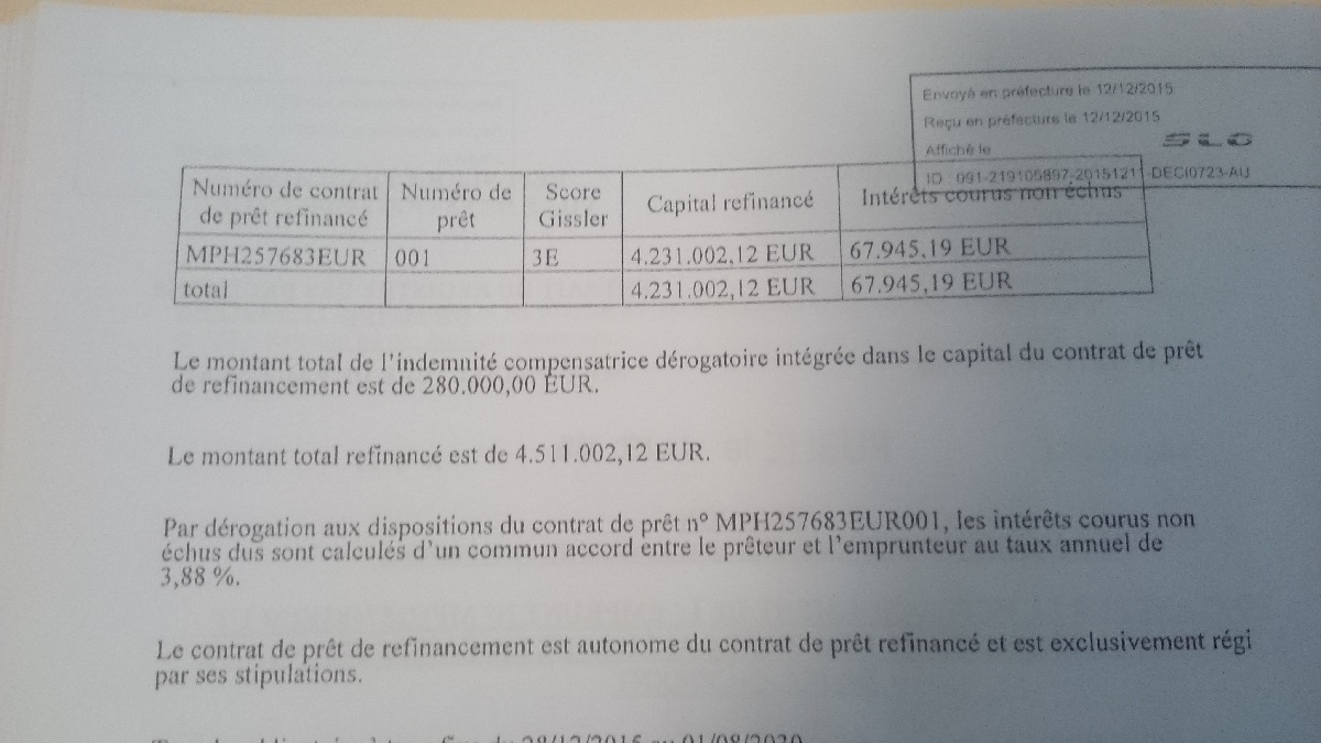 - 4 309 996,61 € signé le 15 mars 2007 sur un taux initial complexe (taux variable qui n’est pas seulement défini comme la simple addition d’un taux fixe usuel de référence et d’une marge exprimée en pourcentage), indexé sur un taux fixe initial de 4 %, de score E1 sur la Charte Gissler.