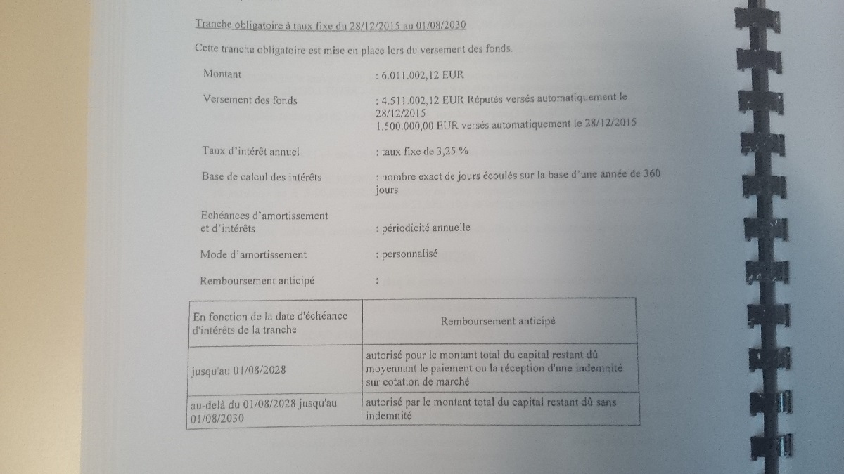 - 6 347 821,86 € signé le 1er septembre 2008 sur un taux initial complexe (taux variable qui n’est pas seulement défini comme la simple addition d’un taux fixe usuel de référence et d’une marge exprimée en pourcentage), indexé sur un taux fixe initial de 3,69 %, de score E3 sur la Charte Gissler.