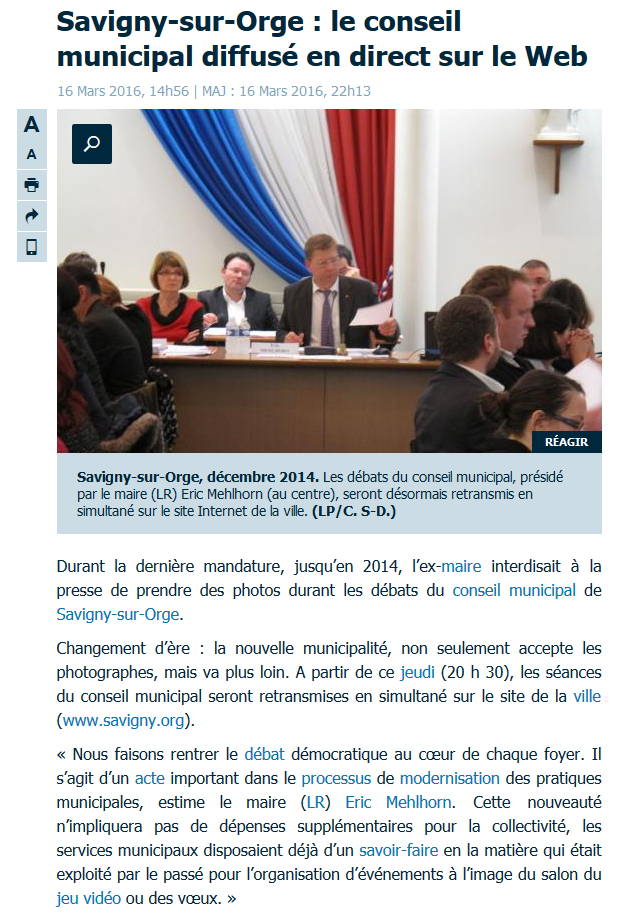 Si filmer le Conseil municipal, et le retransmettre en direct ne coûte rien, pourquoi M. MEHLHORN a-t-il attendu 24 mois de mandat pour s’y mettre, non sans avoir spécifié qu’il ne les avaient pas en juin 2014 dans le débat du Conseil municipal du 10/06/14 à la une. À Savigny, on ne trouve pas de moyens pour l’enfance et la jeunesse, la culture, le sport et les associations, mais pour la pseudo-démocratie locale, on y arrive très bien…