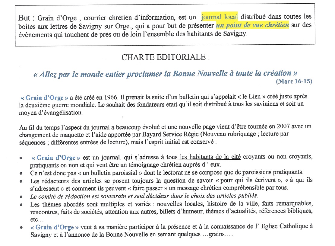 Désormais, les articles ne sont plus écrits par des bénévoles de Savigny mais ils sont extraits de revues chrétiennes. Au lieu d’un comité de rédaction, tout est géré par le prêtre qui est le responsable du secteur pastoral (des paroisses de Savigny et de Viry) qui rédige également l’édito. Enfin, c’est donc bien le religieux qui a récupéré un outil créés par des laïcs.