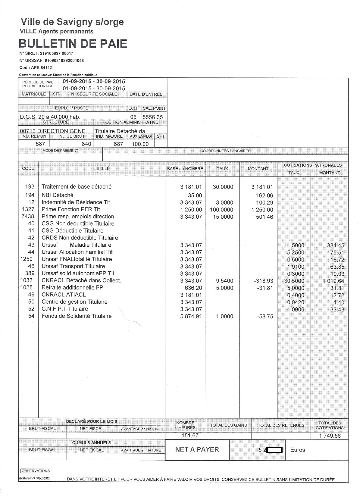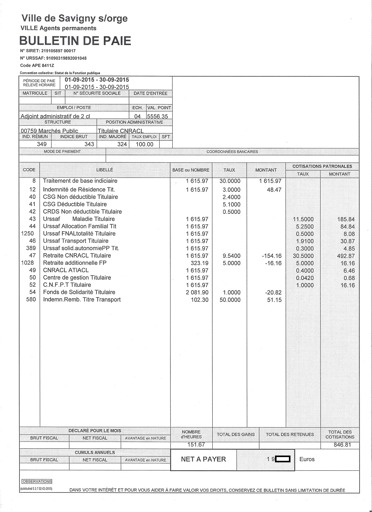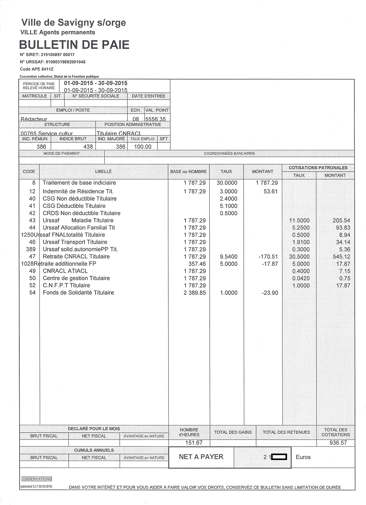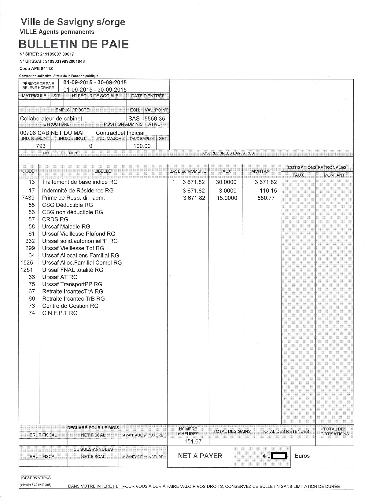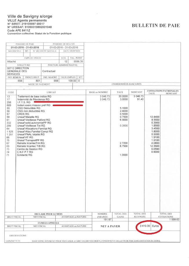 Je précise que l’intégralité des documents qui vont suivre m’ont été légalement remis par la Ville de Savigny-sur-Orge. Que les totaux ne tombent pas juste n’est pas de mon fait ! Les salaires correspondent à la période de paie indiquée en haut à gauche des bulletins.
