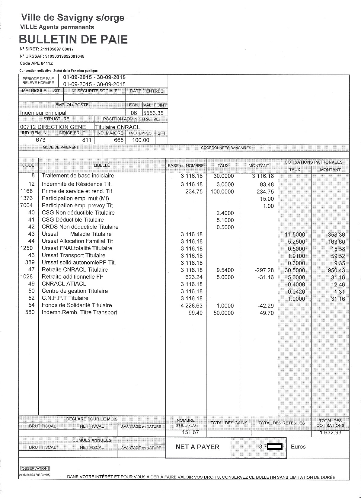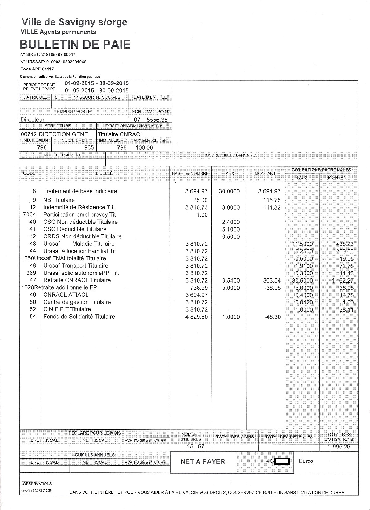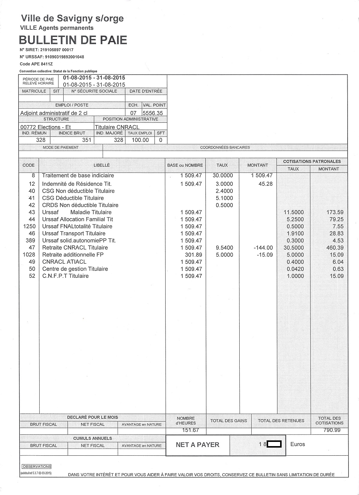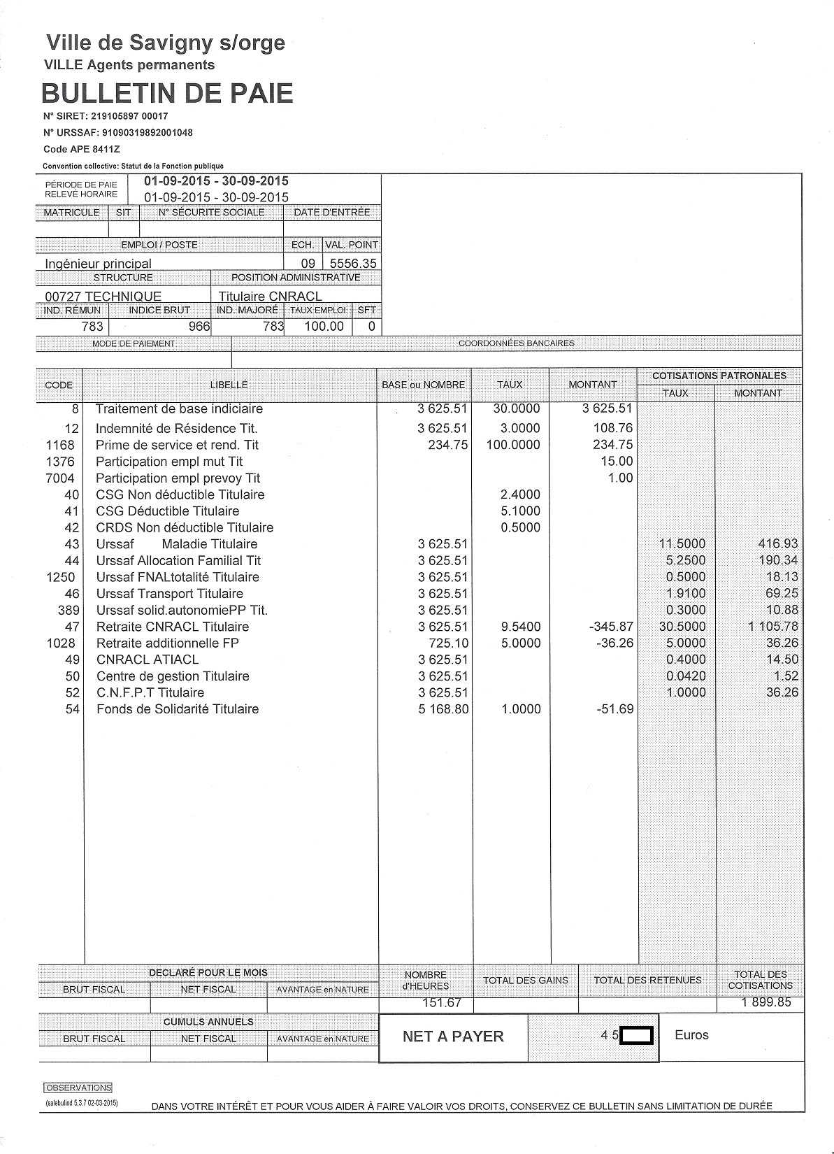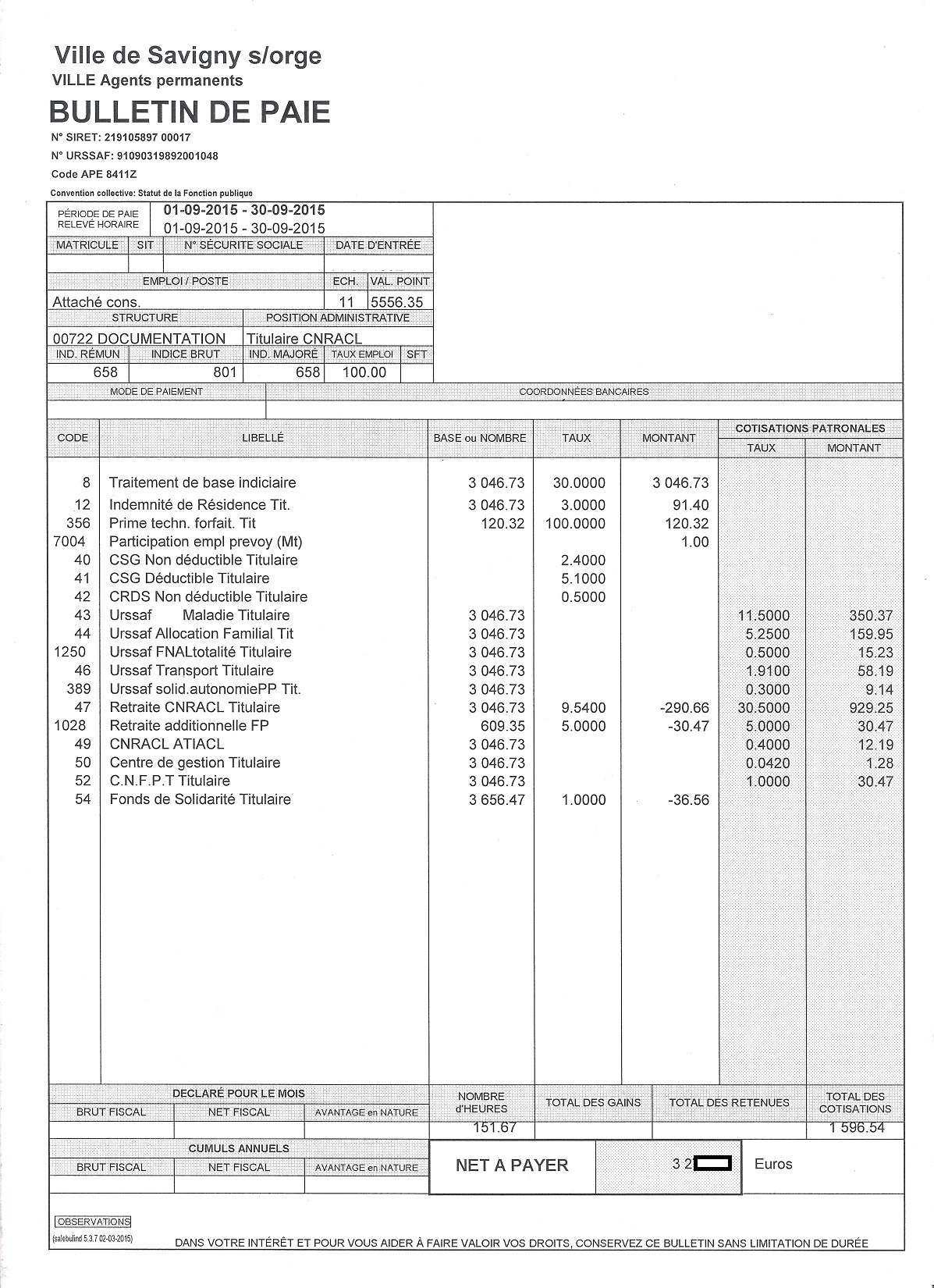 Je précise que l’intégralité des documents qui vont suivre m’ont été légalement remis par la Ville de Savigny-sur-Orge. Que les totaux ne tombent pas juste n’est pas de mon fait ! Les salaires correspondent à la période de paie indiquée en haut à gauche des bulletins.