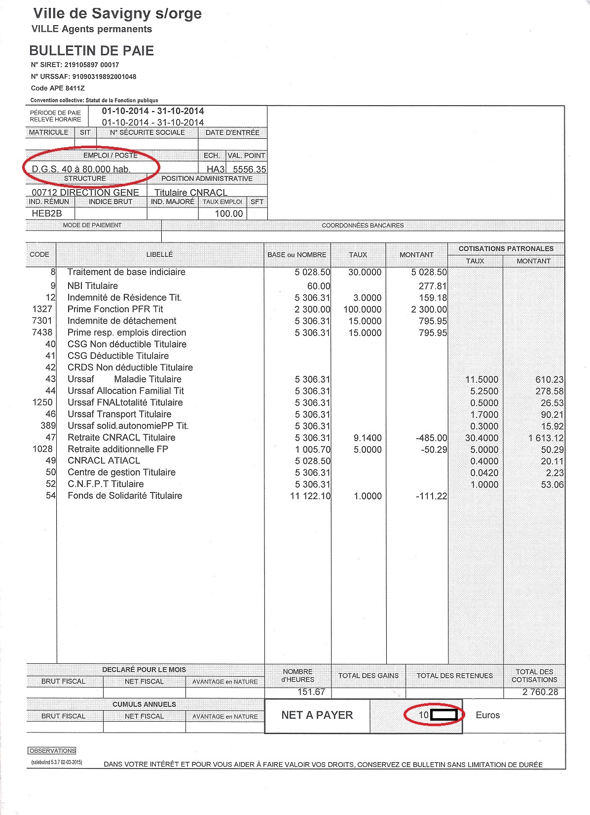 Au secours, cabinet SEBAN à 150 € de l’heure payés par l’argent des Saviniens, Olivier VAGNEUX publie les feuilles de paie des agents communaux (de la plupart desquelles l’administration de Savigny a légalement enlevé les primes parce qu’il faudrait pas qu’on puisse croire que les responsables sont trop payés). Qu’est-ce qu’on peut faire ? Rien parce que la Loi autorise effectivement à publier ces bulletins (argent public !!!).