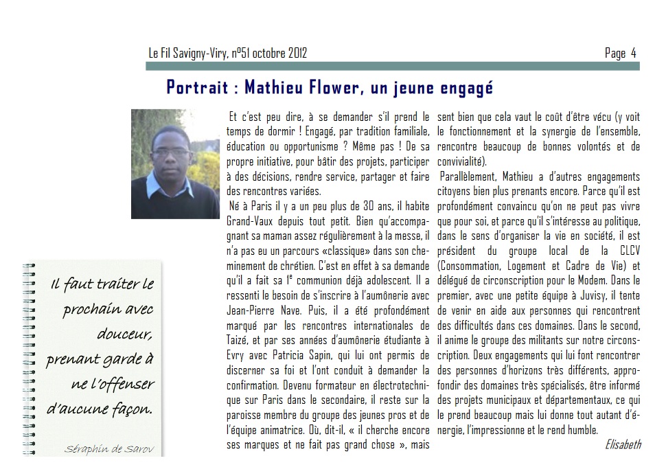C’est une jolie page de publicité gratuite à laquelle a eu droit le maire-adjoint Mathieu FLOWER dans un journal chrétien de Savigny et de Viry, dans un portrait consacré à sa vocation politique. Outre que je pense que Mathieu n’est pas très chrétien dans son comportement d’élu, je constate surtout que sa vocation est un délire verbal imaginaire. J’espère au moins qu’il a du recul pour se rendre compte qu’il ne fait pas ce qu’il dit…