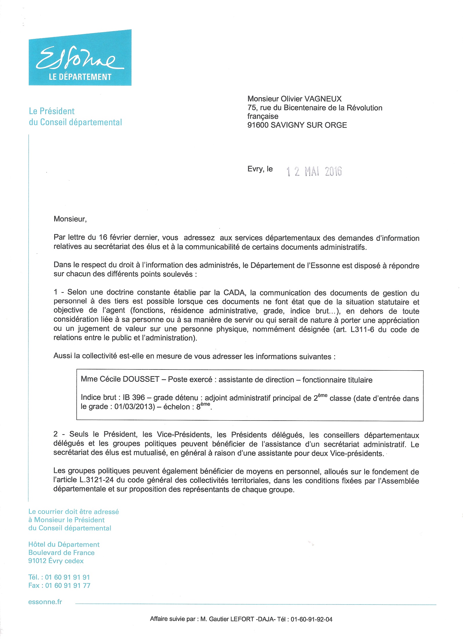 Par courrier en date du 12 mai 2016, et courriel en date du 20 mai 2016, nous avons reçu communication du président du Conseil départemental, qui soit écrit en passant, en ne répondant pas à la CADA, nous a fait une rédite (une imitation d’un mauvais comportement de Robin RÉDA). Nous avons alors seulement reçu de ce qui était factuellement demandé la fiche de poste de Mme DOUSSET et les fiches de poste des chargés de mission des agents.