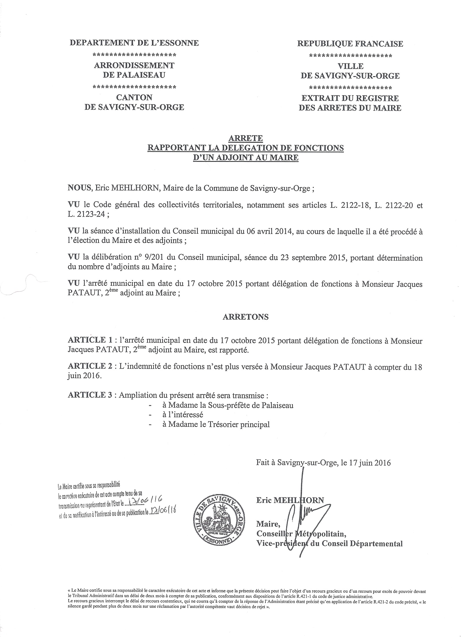 Mais qui va-t-il rester pour s’occuper des grands travaux, et de la modernisation de Savigny-sur-Orge ? Ce 17 juin 2016, le maire Éric MEHLHORN a rapporté la délégation de fonctions de Jacques PATAUT. Le Conseil municipal va donc devoir, lors de sa prochaine réunion du 23 juin 2016, se prononcer sur le maintien de l’homme en tant qu’adjoint. En privé, selon deux de mes sources, Jacques PATAUT annoncerait qu’il va démissionner.