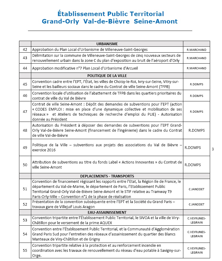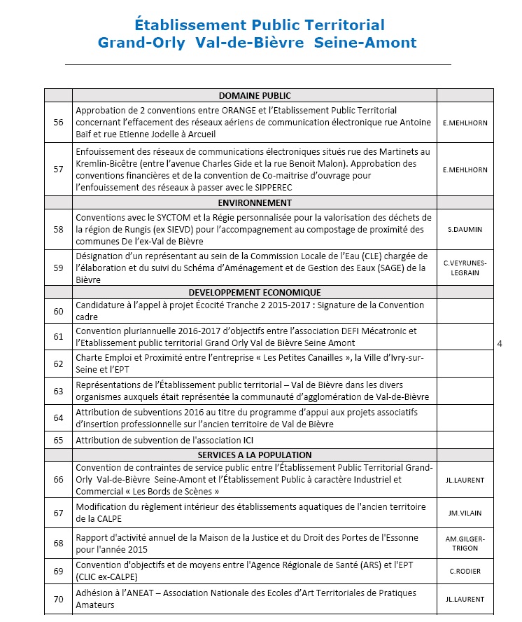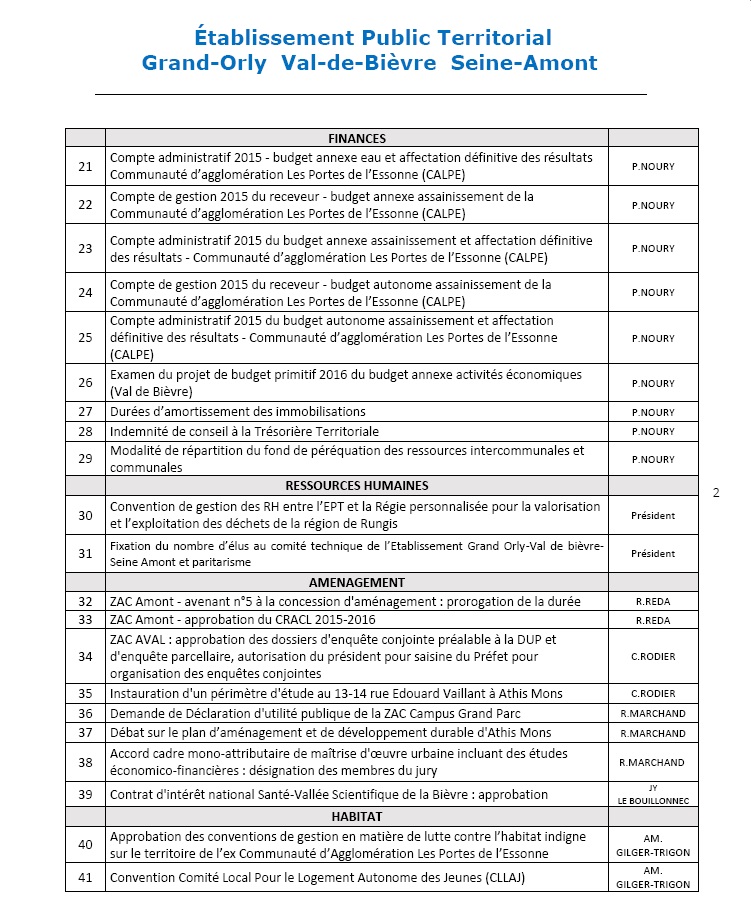Sur le chapitre Finances, nous serons attentifs à la décision modificative du budget 2016, ainsi qu’aux montants excédentaires des différents comptes administratifs. À noter que l’ancien Val-de-Bièvre bénéficiera d’un budget primitif pour ses activités économiques. Les durées d’amortissements des immobilisations nous parleront de la santé financière de notre interco tandis que les modalités de réparation des fonds de péréquation seront à garder en mémoire.