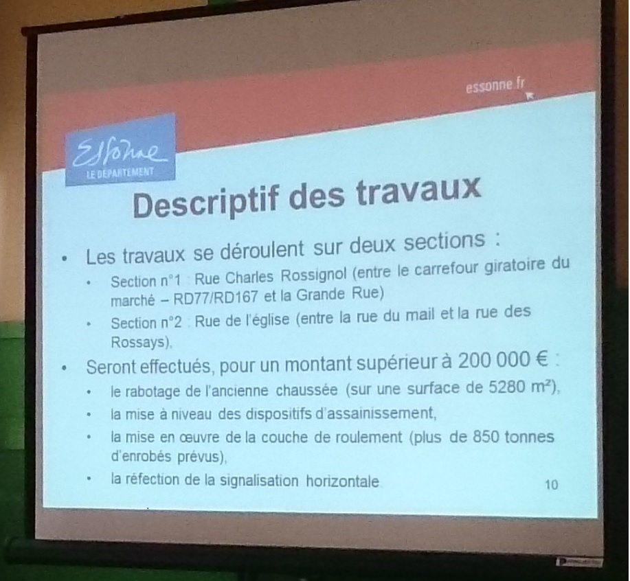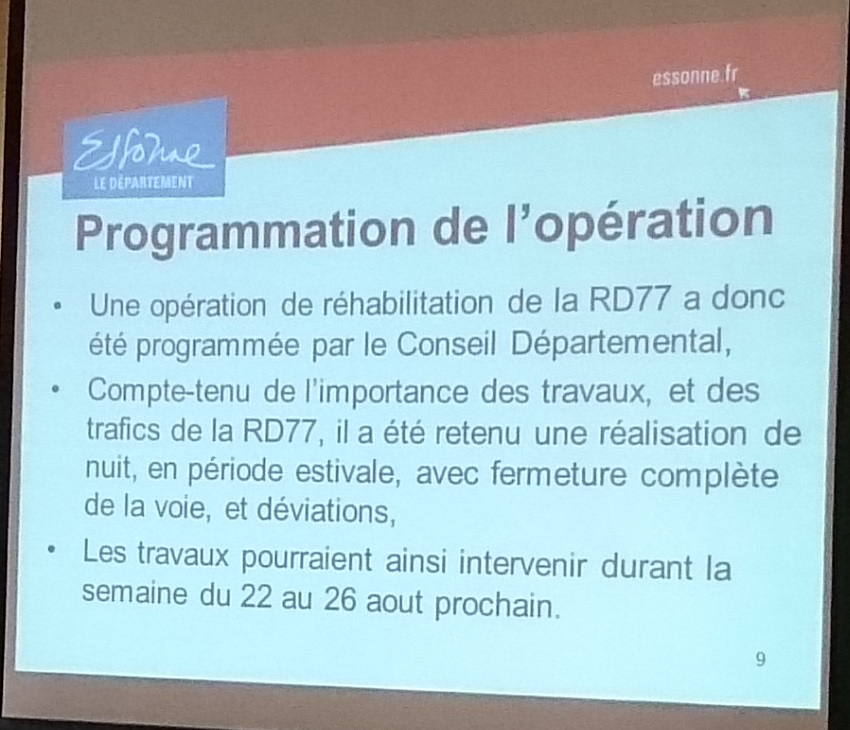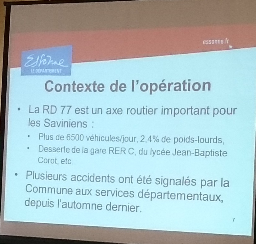 Une réunion publique à destination des riverains de la RD 77 était organisée ce mercredi 6 juillet 2016 par le maire de Savigny-sur-Orge, pour présenter les travaux de rénovation de cette route sur deux sections (rue Charles-Rossignol et rue de l’église + début de la rue des Rossays). Pour l’occasion, le maire avait invité Étienne DEREU, Directeur général adjoint du Conseil départemental en charge des équipements et de l’environnement.