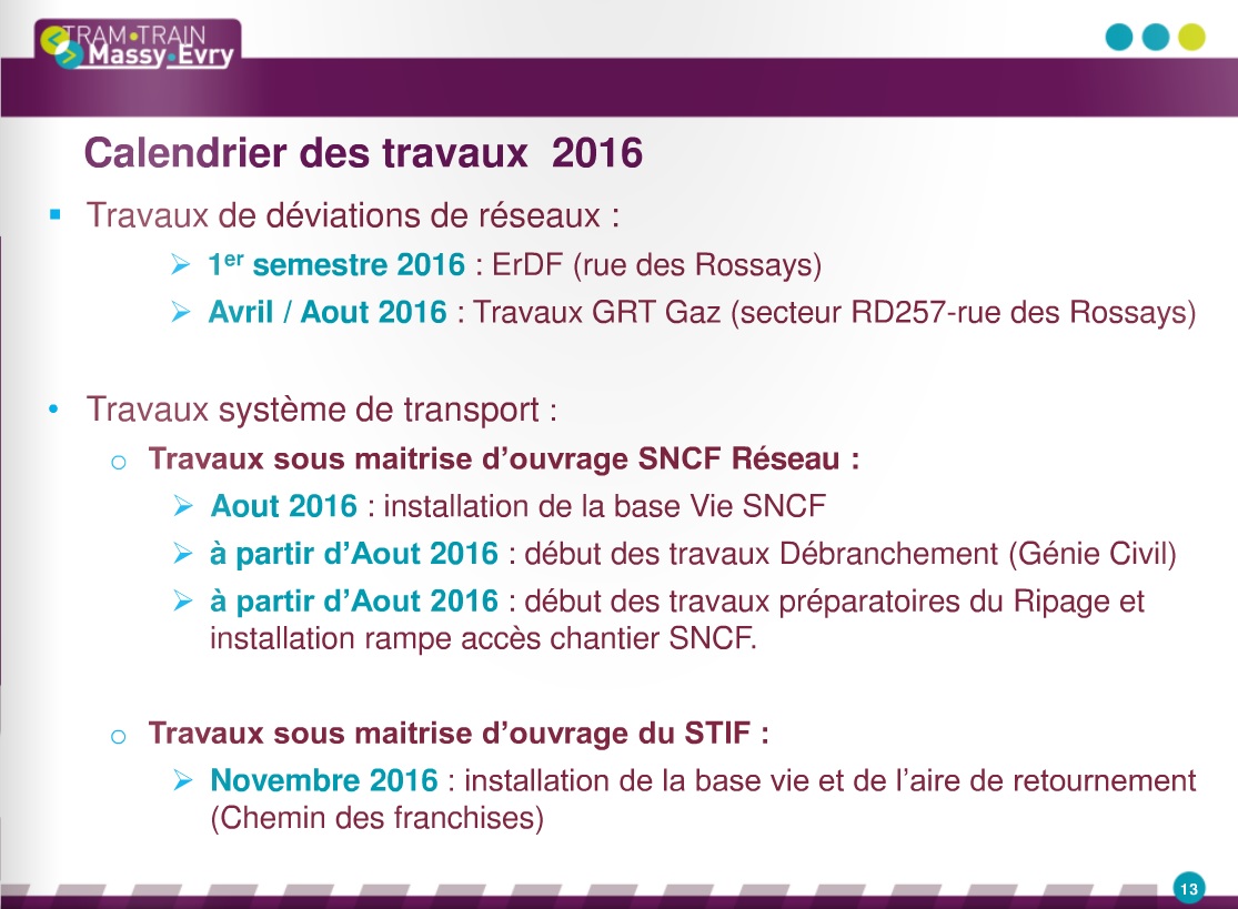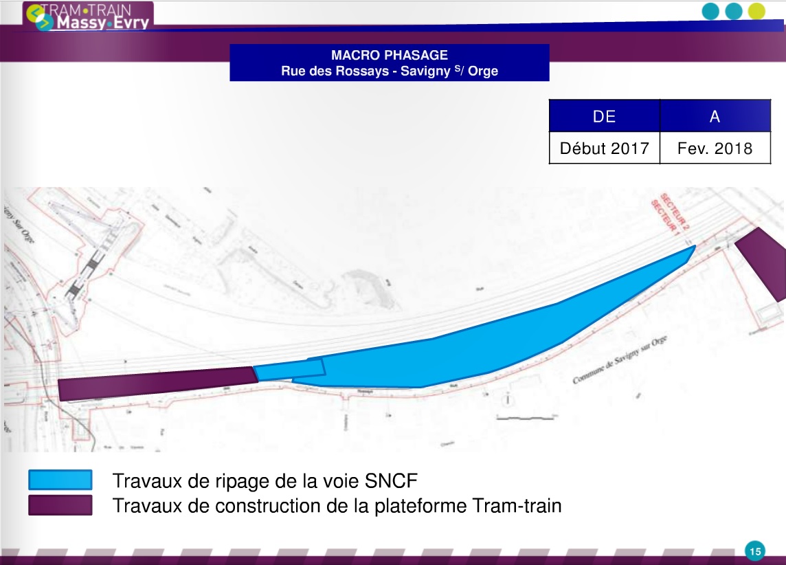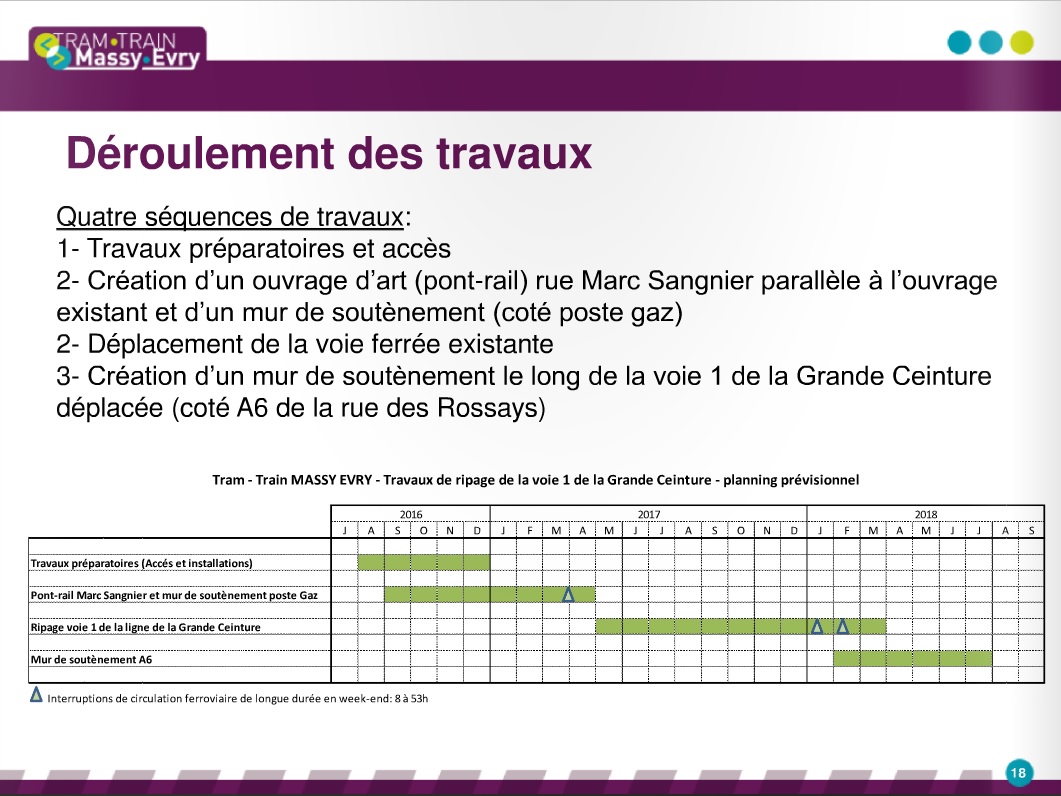 « Des études, dites PROJET, sont actuellement en cours de finalisation. Dès qu’elles seront validées par les partenaires, le site internet sera mis à jour afin d’expliquer au plus grand nombre les principes d’insertion du projet. Toutefois, et afin de vous fournir plus d’informations sur les évolutions du projet et les prochaines phases de travaux, vous trouverez en fichier joint le support présenté à l’association des riverains de la rue des Rossays à Savigny-sur-Orge.