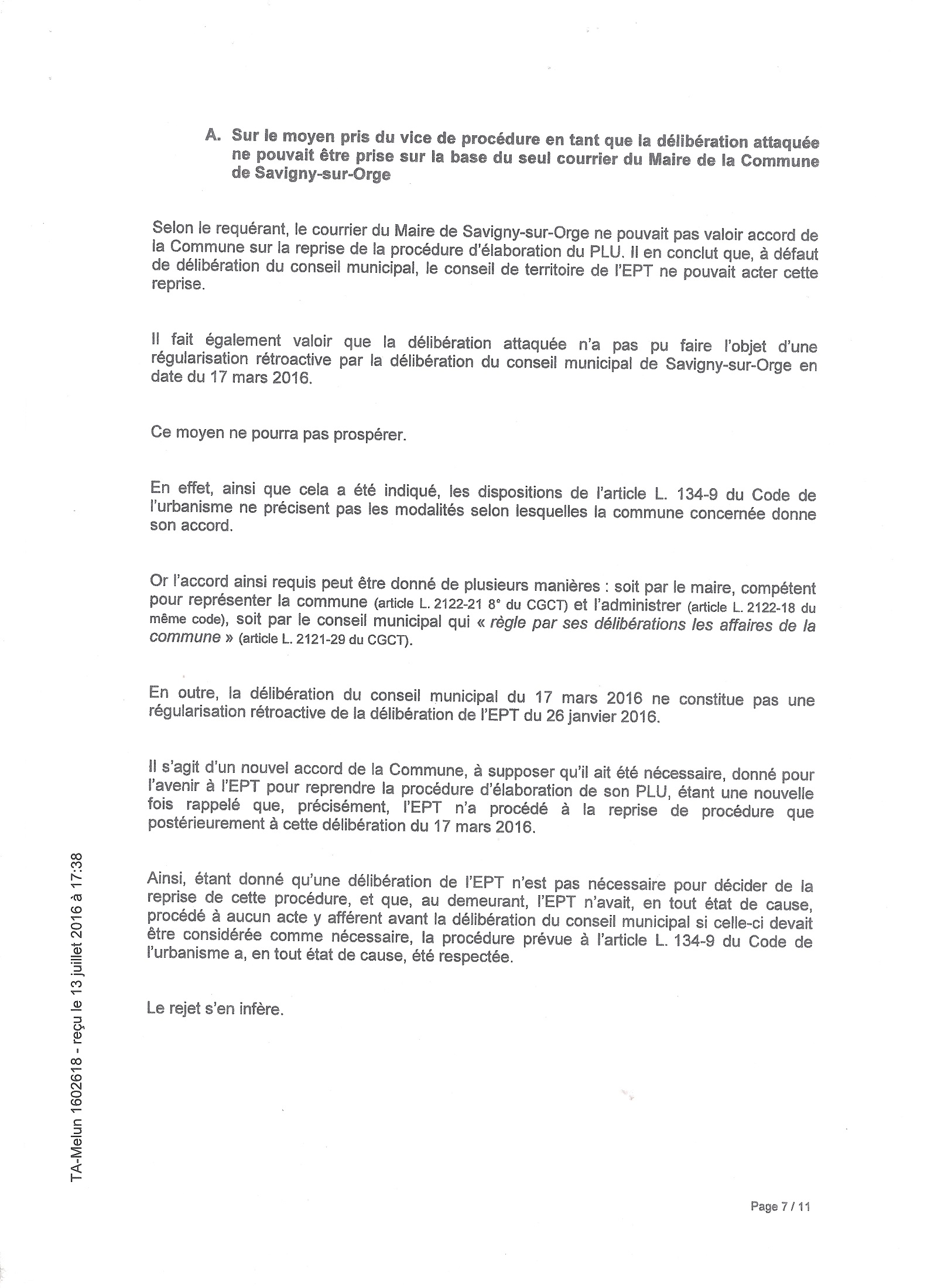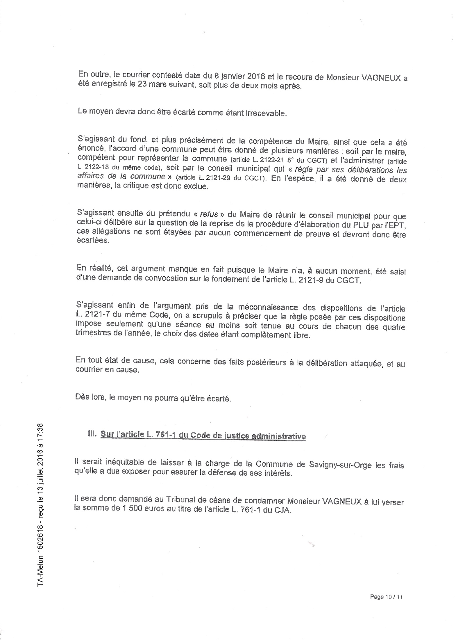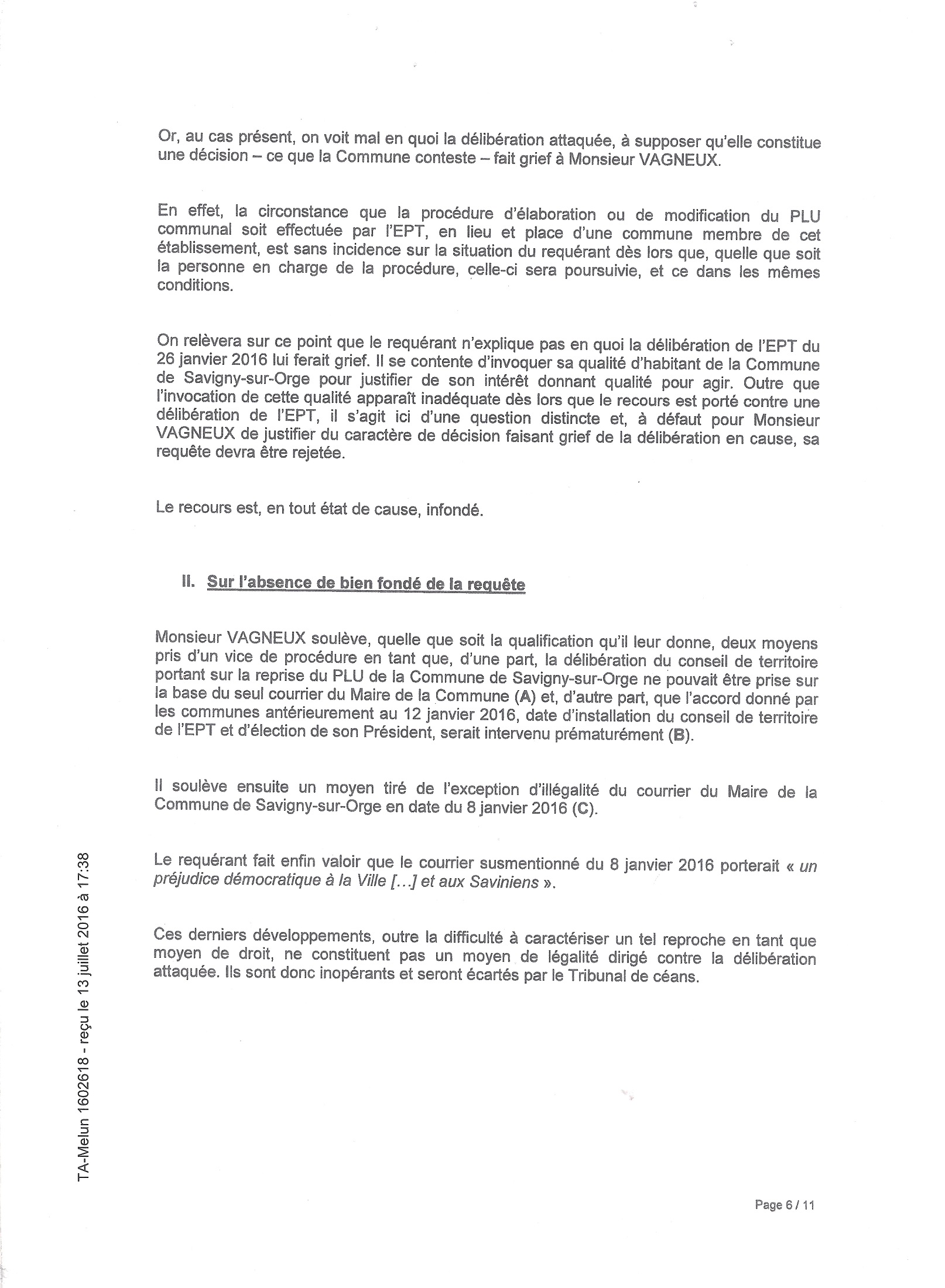 Toujours est-il que pour ne pas faire annuler deux actes administratifs municipaux, faisant perdre un peu de sa souveraineté à Savigny-sur-Orge, votés sur le fondement de la délibération de l’agglomération que j’attaque, la Ville va en défense. C’est du masochisme pur, mais il ne faudrait en effet pas reconnaître que le génial Conseil municipal de Savigny ait pu se tromper, ou ne pas respecter la Loi. Pensez donc, ce serait bien la première fois que cela arriverait…
