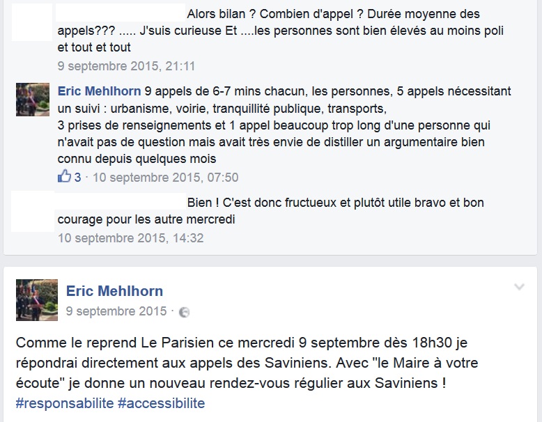 Non, je vous propose qu’on dresse un court bilan au bout d’un an de pratique par rapport aux échos que j’en ai eu, tant du côté de la mairie que des citoyens qui appellent. Et c’est là que le bat blesse car dans le fond, personne n’est réellement satisfait des permanences. Cela avait pourtant plutôt bien démarré du fait de la curiosité des Saviniens, et le maire en était tout fier sur sa page Facebook : régularité, responsabilité et accessibilité qu’il nous disait alors…