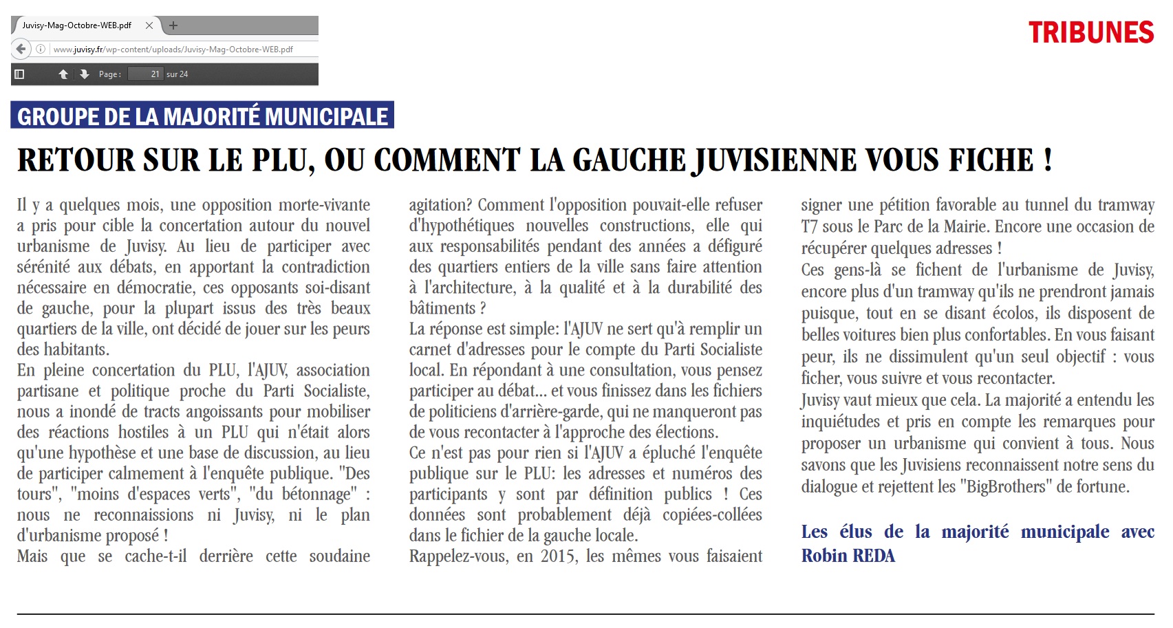 Si on m’accuse régulièrement d’être virulent sur mon blog, parfois même insultant ; que ne devrait-on pas dire de la majorité municipale de Juvisy-sur-Orge ? Dans sa tribune du magazine municipal d’octobre 2016, celle-ci accuse l’opposition de gauche de « ficher » les Juvisiens (ce qui est illégal). Une accusation diffamante qui pourrait justifier une plainte de l’opposition, décrite ici comme « morte-vivante » ; ce qui démontrerait sa vitalité…