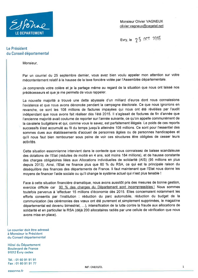 Je vous remercie d’avoir pris le temps de me répondre, une fois de plus, à mon courriel du 25 septembre relatif à mon mécontentement de voir ma taxe foncière augmenter de 20 % à cause de hausses conjointes votées dans ma Ville de Savigny-sur-Orge, et au Département.
