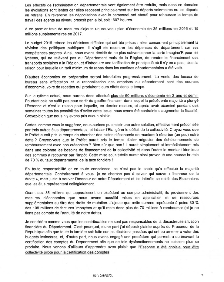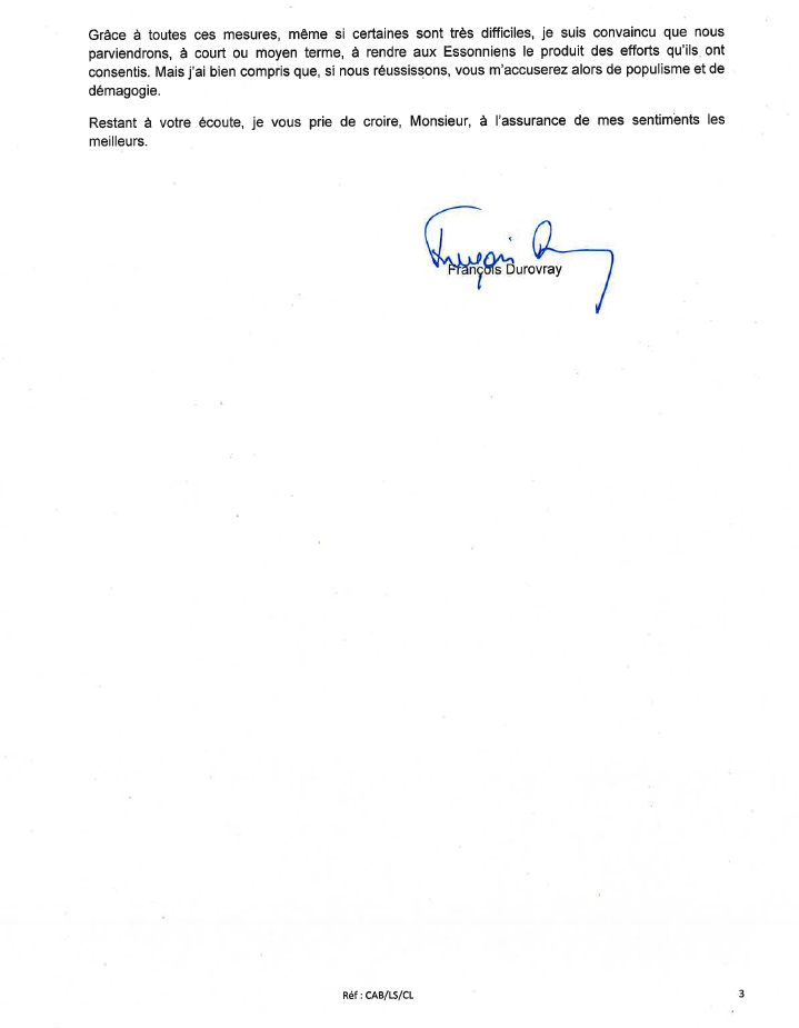 P.P.-S. : J’attends toujours de savoir combien le courrier daté du 29 janvier 2016 a coûté aux Essonniens… Je comprends mieux pourquoi nos conseillers départementaux élus avant 2015 n’ont pas pu consulter les factures, si c’était comme cela sous GUEDJ.