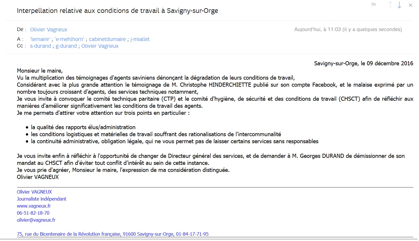 Aujourd’hui, j’en appelle aux agents et je les invite à parler, ensemble, ouvertement et publiquement pour dénoncer leurs conditions de travail. Ils ne sont pas au service des élus mais bien à celui des Saviniens. Ils ne doivent pas accepter d’être méprisés dans leur travail ! Et la première manière pour les agents saviniens d’obtenir de la considération est de refuser les ordres illégaux que peuvent leur donner le cabinet du maire, les élus ou les responsables.